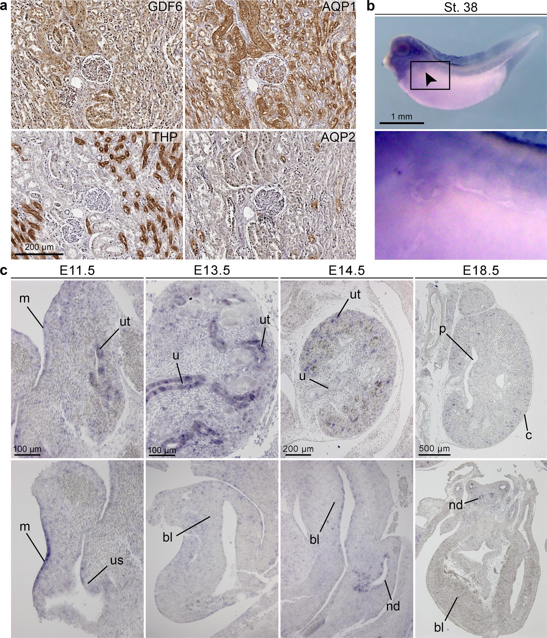 a By immunohistochemical detection of GDF6 and the marker proteins aquaporin-1 (AQP1, straight and convoluted proximal tubule and thin descending limb of loop of Henle), aquaporin-2 (AQP2, collecting duct), and Tamm-Horsfall protein (THP, thick ascending limb of loop of Henle and distal tubule) in a normal human infant kidney section, GDF6 localized most prominently to proximal tubules. b By whole-mount RNA in situ hybridization in Xenopus laevis at stage 38, gdf6 was expressed in the tissue surrounding the pronephric tubule (arrow, enlarged image) as well as in the developing eye, branchial arches, notochord, and neural tube. c RNA in situ hybridization analysis on sagittal sections of the murine kidney and bladder from E11.5 to E18.5. Gdf6 expression was present in all compartments of the developing ureteric tree, including the ureteric tips (ut) and the ureter (u), at E11.5 to E14.5, dropped after onset of collecting duct differentiation, and was barely detectable at E18.5 (p pelvis, c cortex). In the lower urogenital tract, Gdf6 expression was found in the mesothelial lining (m) of the abdominal cavity at E11.5, in the undifferentiated urothelium of the urogenital sinus (us) and the bladder (bl) until E14.5, and in the nephric duct (nd) of male embryos at all analyzed stages (data partly not shown). Sections from three independent murine specimens were analyzed.