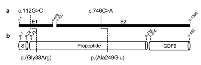 Supplementary Fig. 1 Location of two GDF6 variants identified in three patients with renal anomalies in this study. a Schematic view of coding sequence of human GDF6 mRNA (NM_001001557.4). E1, exon 1; E2, exon 2. b The human GDF6 protein sequence consists of a N-terminal signal peptide sequence (S), a propeptide/prodomain sequence, and a C- terminal mature protein sequence (GDF6) (https://www.uniprot.org/uniprot/Q6KF10). Both variants detected in this study are located in the GDF6 propeptide. Structures were designed using ExPASy prosite MyDomains (https://prosite.expasy.org/mydomains).