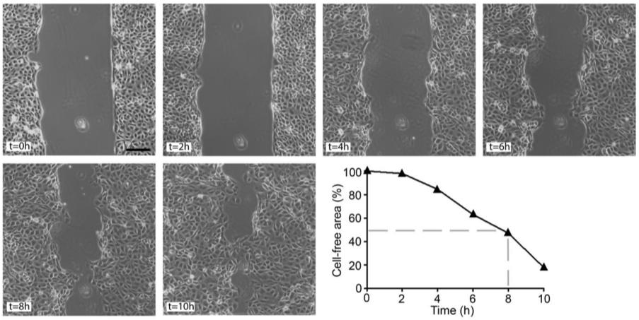 Supplementary Fig. 4 Time series of mIMCD3 cell migration. The speed of mIMCD3 cell migration and, thereby, the optimal duration of a wound healing assay using these cells was determined at intervals of 2 h for a total time period of 10h. After 8 h, the gap size was reduced by 50%. Therefore, this time point was chosen for subsequent analyses (see Fig. 3 and Supplementary Fig. 5). Scale bar: 150 μm.