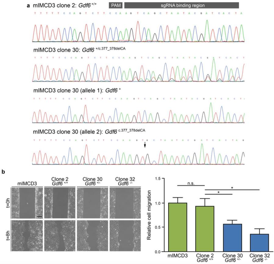 Supplementary Fig. 5 Migration is significantly impaired in Gdf6+/- murine IMCD3 cell clone 30 generated by CRISPR-Cas9 technology and analyzed because the GDF6 variants identified in patients were heterozygous. a Electropherograms of the murine Gdf6 sequence in exon 1 targeted by the single guide RNA (sgRNA) used for CRISPR-Cas9 genome engineering in mIMCD3 cell clone 30 compared to Gdf6+/+ mIMCD3 cell clone 2. The Gdf6 sequence variation in mIMCD3 cell clone 30 was heterozygous as confirmed by allele separation revealing the Gdf6 wildtype sequence on one allele and the deletion c.377_378delCA causing a frameshift predicted to lead to a non-functional protein, p.(Ser126Cysfs*2), or nonsense-mediated mRNA decay on the other allele. The protospacer adjacent motif (PAM) for Cas9 binding and the sgRNA target region are shown in a. b Migration of Gdf6+/- mIMCD3 cell clone 30 was significantly reduced after 8 h compared to Gdf6+/+ mIMCD3 cell clone 2, but lesser so than migration of Gdf6-/- mIMCD3 cell clone 32; results are mean ± SD from three independent experiments. Scale bar: 150 μm.