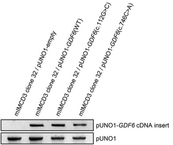 Supplementary Fig. 6 Murine IMCD3 cell clone 32 (Gdf6-/-) was stably transfected with pUNO1 expression constructs harboring no insert (empty), human GDF6 wildtype or mutant cDNAs after two weeks of selection using the antibiotic blasticidin S. Primers had been designed to amplify a fragment encompassing sequences of the pUNO1 backbone (pUNO1, bottom row) or of pUNO1 backbone and parts of GDF6 cDNA insert (pUNO1-GDF6 cDNA insert, top row) (Supplementary Table 7). PCR amplification was performed using genomic DNA isolated from cells after blasticidin S selection. Stable integration of empty, GDF6 wildtype- or variant-containing pUNO1 plasmid into genomic DNA was verified in all generated cell lines demonstrating stable transfection.