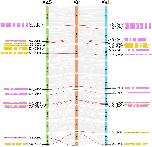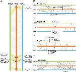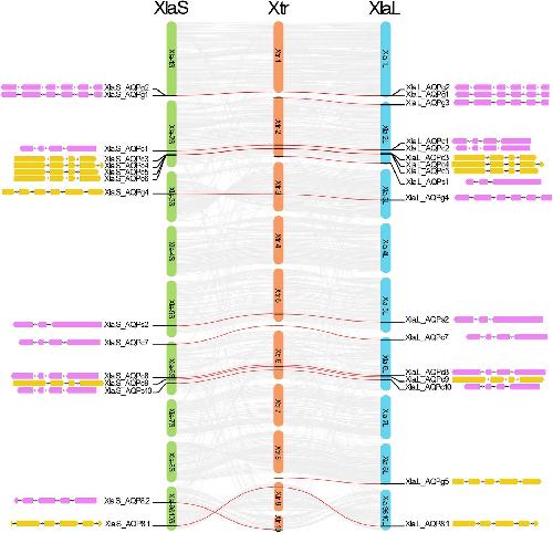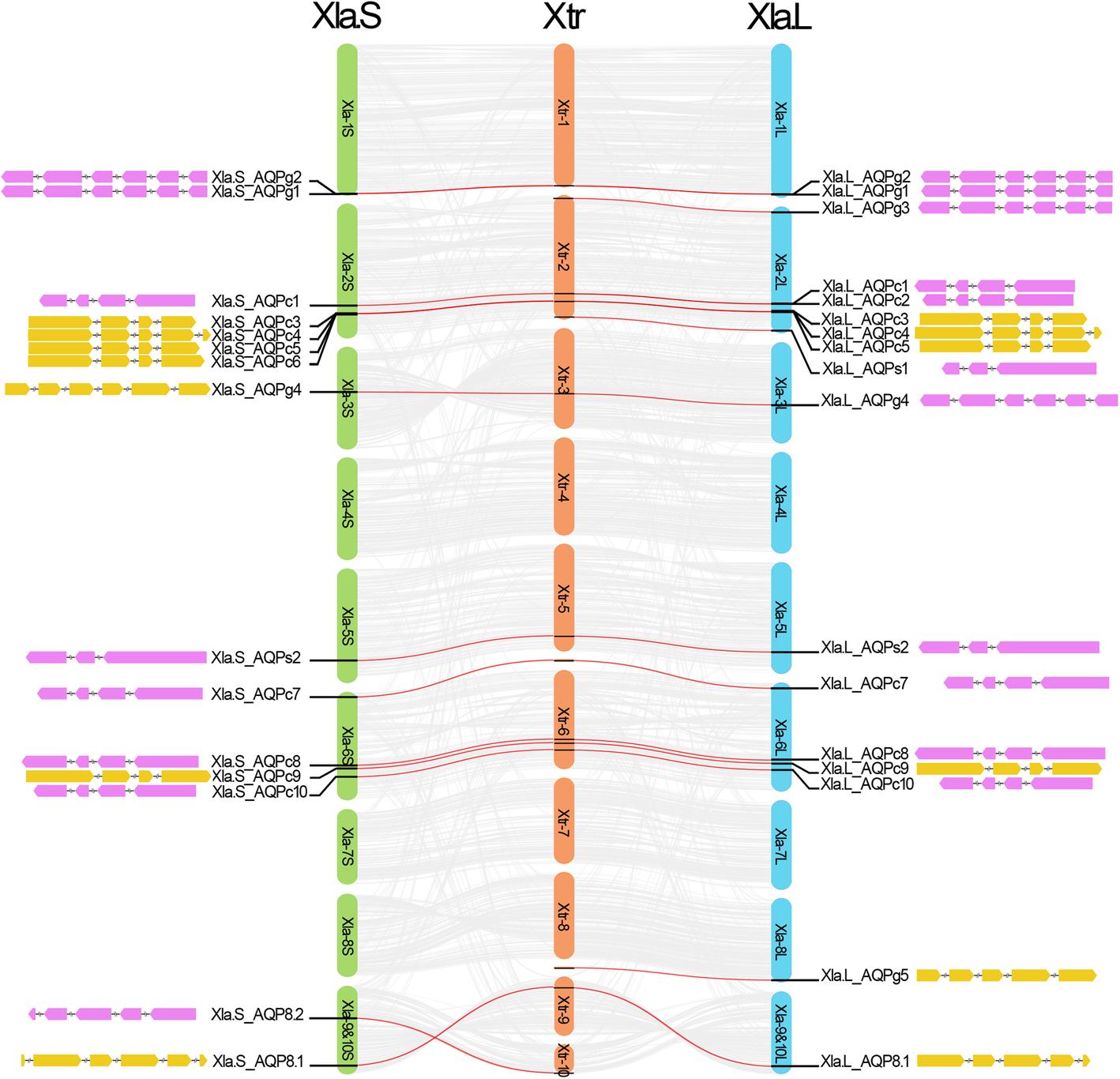 Fig. 1 Synteny analysis between the homeologs in X. laevis and X. tropicalis genome. The linkages between the AQP genes were marked with red lines. Genome location and gene structure of the AQP genes in X. laevis genome were shown beside the chromosomes. The wedges colored in violet and yellow represent the exon regions in AQP genes. Different color represents the different encoding direction. The shrinked lines represent the intron regions