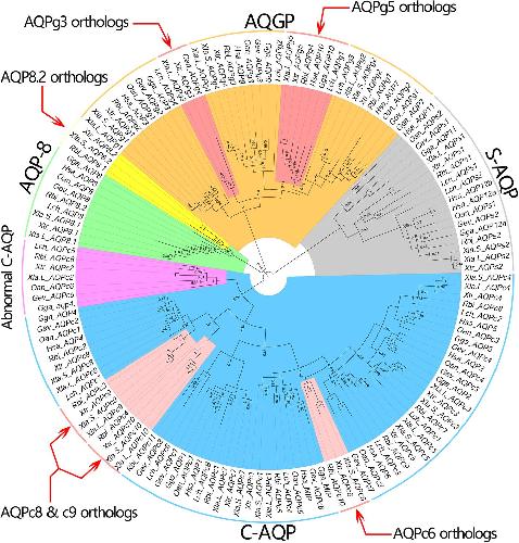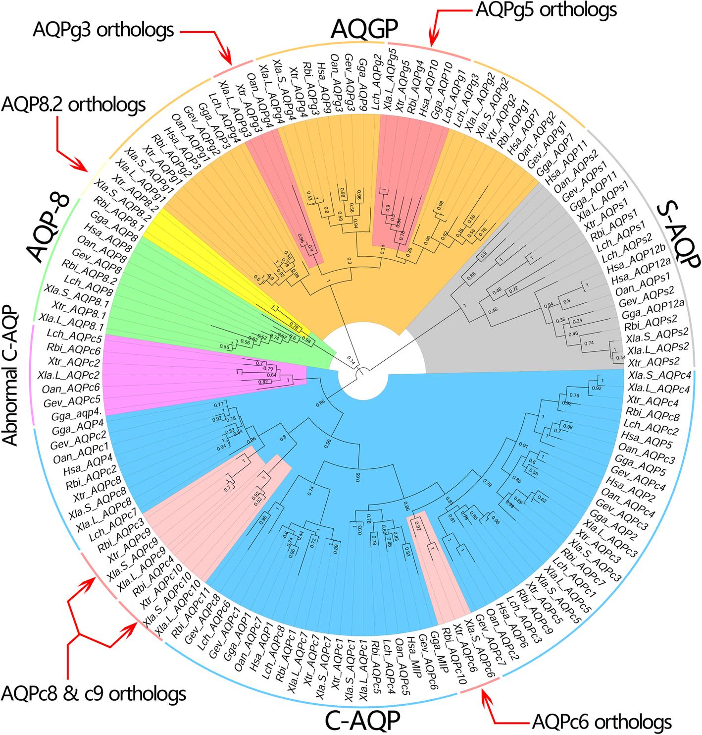 Fig 2. Maximum likelihood based phylogenetic tree of the AQP families in vertebrates. The AQP families were distinct separated into four clades (marked with different colors), representing the four subfamilies respectively. The protein sequences were collected from the following species: Latimeria chalumnae (Lch), Rhinatrema bivittatum (Rbi), Xenopus laevis (Xla), Xenopus tropicalis (Xtr), Gopherus evgoodei (Gev), Gallus gallus (Gga), Ornithorhynchus anatinus (Oan), Homo sapiens (Hsa)