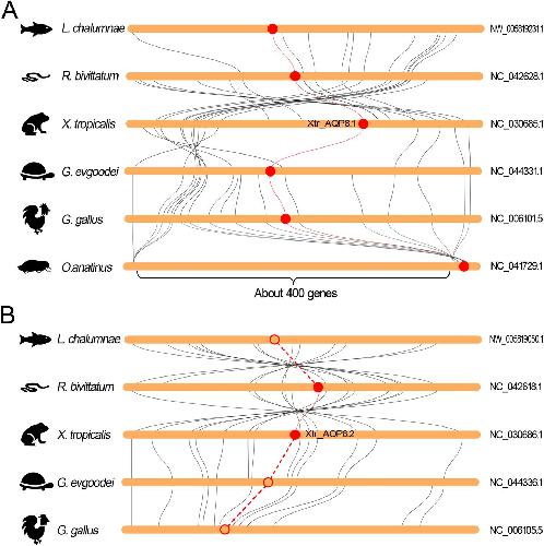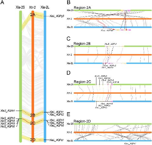 ig. 3 Deletion of AQP genes in the second pair chromosomes in X. laevis. a Synteny analysis of the second chromosomes in the homeologs in X. laevis and X. tropicalis genome. The regions encoding AQP genes were shadowed in light yellow. The linkages between AQP genes were marked with red line. AQP gene names in Xla genome were marked beside the second chromosomes. b Synteny analysis of region-2A encoding AQPg3 ortholog. c Synteny analysis of region-2B encoding AQPc1 and AQPc2 orthologs. d Synteny analysis of region-2C encoding AQPc3 to AQPc6 orthologs. e Synteny analysis of region-2D encoding AQPs1 ortholog. In this figure, red curves represent the linked genes were appeared in both Xtr and the corresponding homeologs in Xla. Red dashed lines represent the genes that appeared in Xtr genome but absented in Xla genome