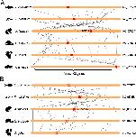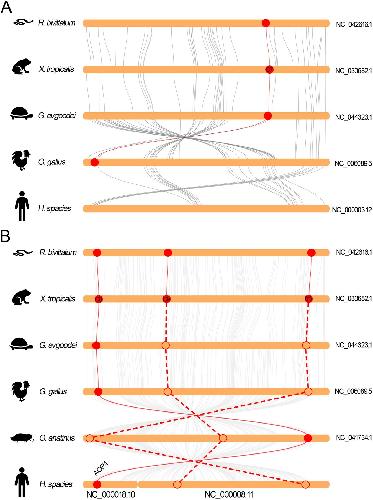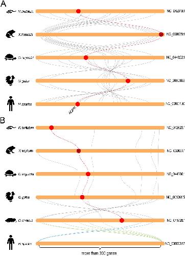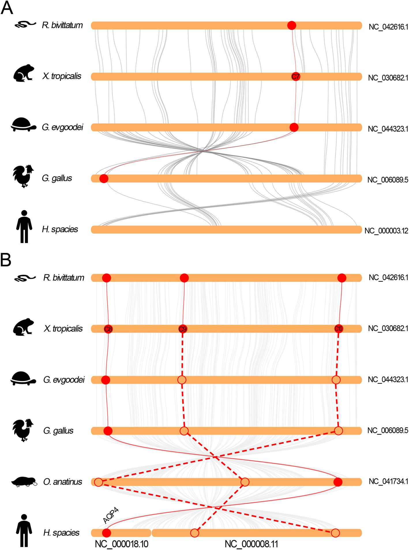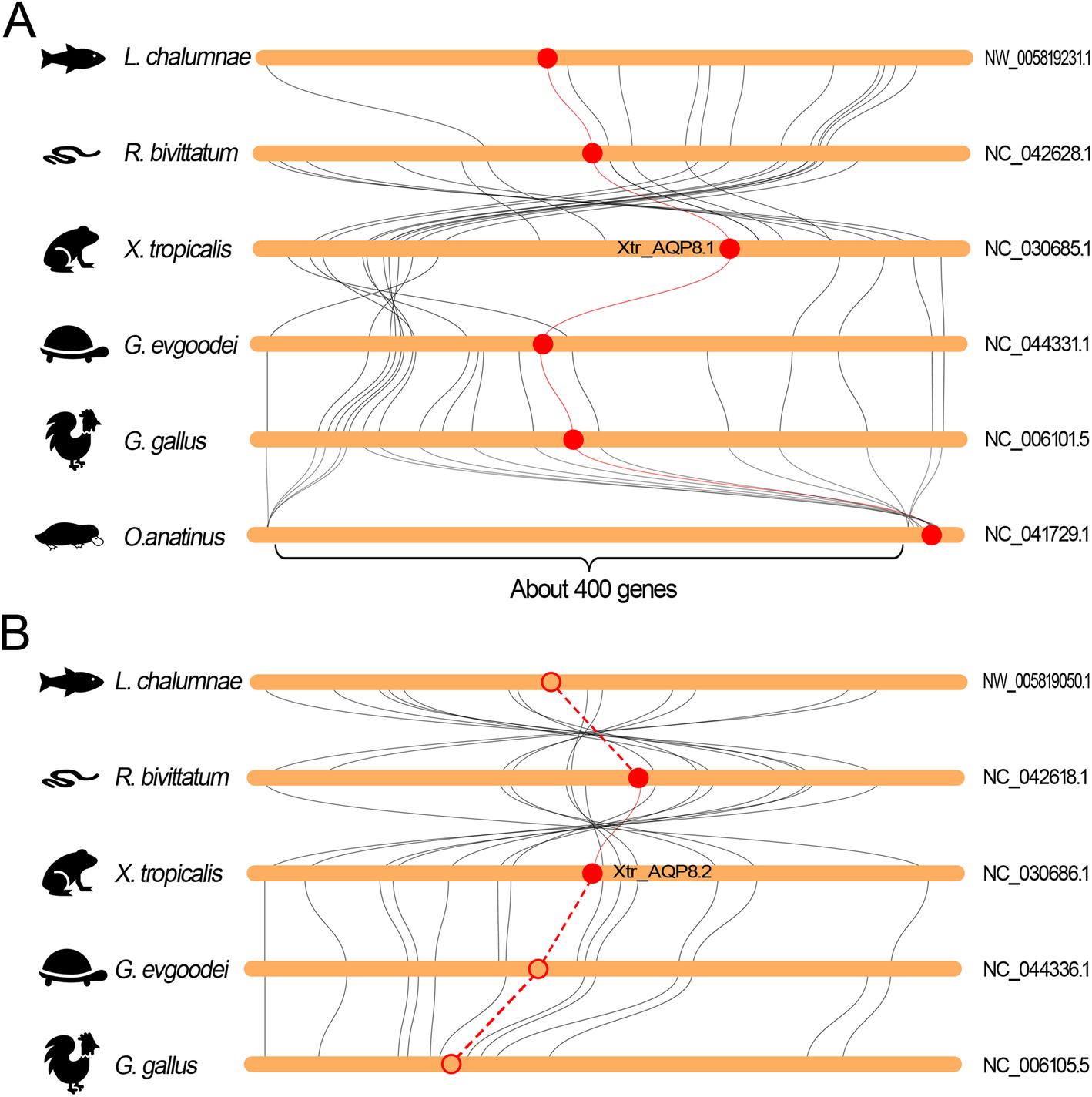 Fig. 7 Collinearity relationship between the orthologs in AQP-8 subfamily in different species. a Collinearity analysis of AQP8.1 orthologs. b Collinearity analysis of AQP8.2 orthologs. The round-corner rectangles filled in yellow represent the conserved regions of the chromosomes in different species. The words behind the round-corner rectangles represent the number of chromosomes. The circles filled in red represent the AQP orthologs appeared in the corresponding chromosome. The hollow circles represent the lost AQP orthologs in the corresponding chromosome. The red curves represent the linkages between the AQP orthologs. The dashed lines represent the imaginary linkages between the lost genes