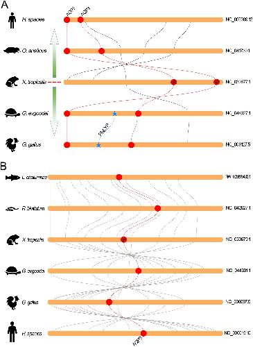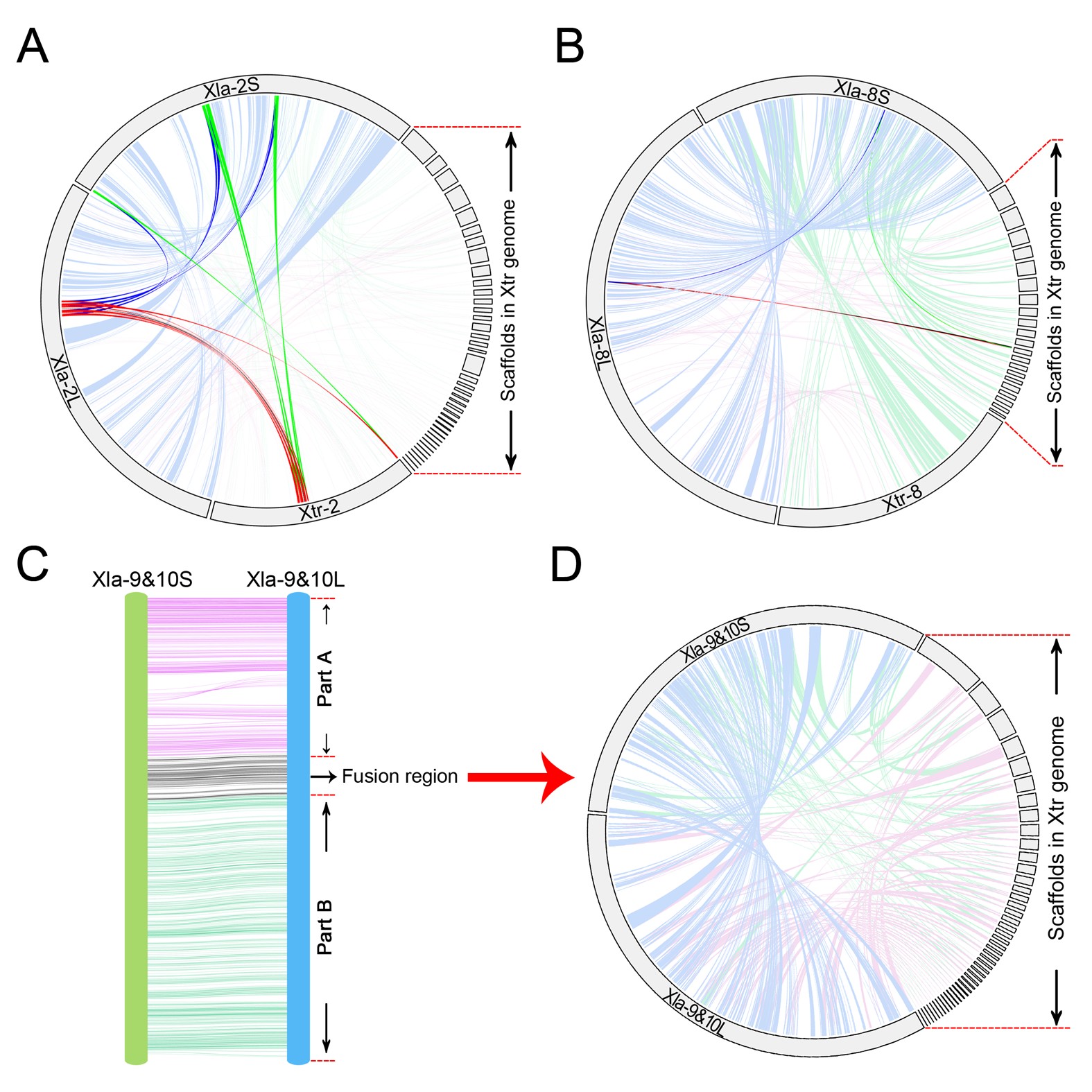 Synteny analyses of the corresponding region in the genome of Xla and Xtr. (A) Collinearity analysis of the region in the end terminal of the second chromosome in Xla and some scaffolds in Xtr. (B) Collinearity analysis of the region in the end terminal of the eighth chromosome in Xla and some scaffolds in Xtr. (C) Collinearity analysis between the ninth pair chromosomes in Xla genome. Part A represent the region corresponding to the tenth chromosome in Xtr genome. Part B represent the region corresponding with the ninth chromosome in Xtr genome. Fusion region represent the genes in this region were not detected in both the ninth and tenth chromosomes in Xtr genome. (D) Collinearity analysis of the fusion region in Xla genome and some scaffolds in Xtr genome.