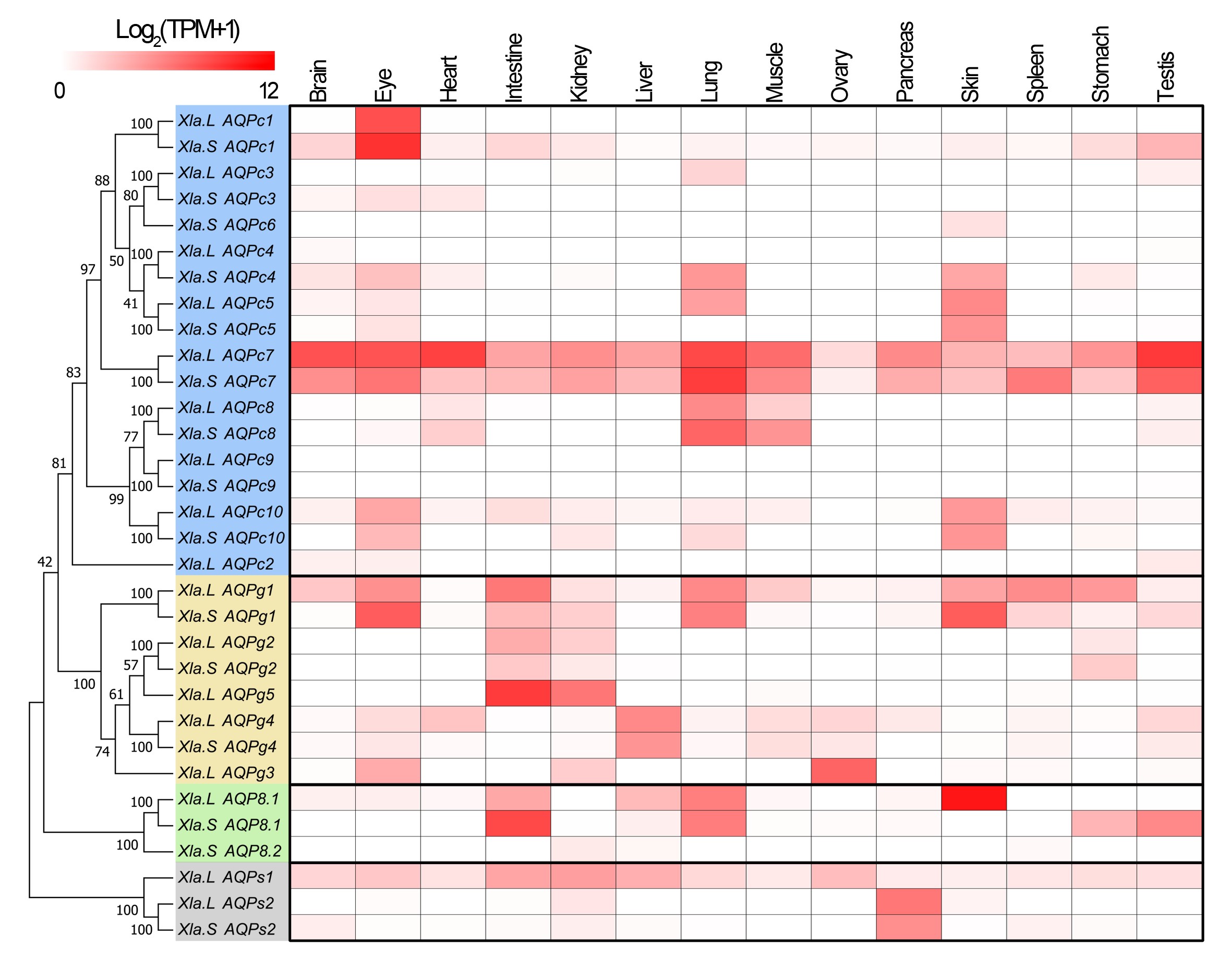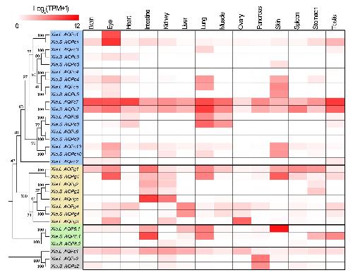 Heatmap of the AQP family expression pattern in different tissues or organs of adult X. laevis.