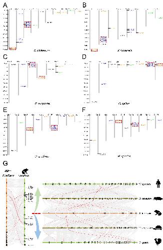 Fig. 4 Synteny analysis of the AQP orthologs in Xenopus species. a Synteny analysis of the eighth pair chromosomes in the homeologs in X. laevis. b Synteny analysis of the region encoding AQPg5 ortholog. c Synteny analysis of the ninth pair chromosomes in the homeologs in X. laevis and the ninth and tenth chromosomes in X. tropicalis genome. d Synteny analysis of the region encoding AQP8.1 ortholog. e Synteny analysis of the region encoding AQP8.2 ortholog. f Synteny analysis of the region encoding AQPc8 to AQPc10 orthologs. In this figure, red curves represent the linked genes were appeared in both Xtr and the corresponding homeologs in Xla. Red dashed lines represent the genes that appeared in Xtr genome but absented in Xla genome
