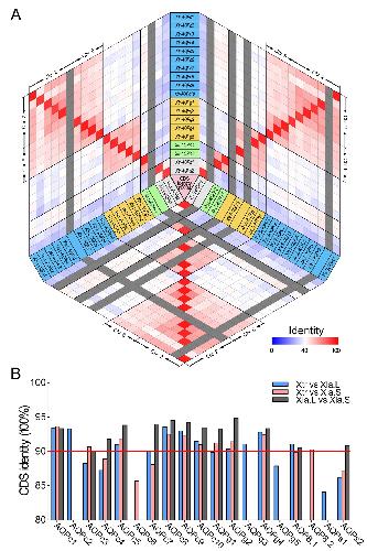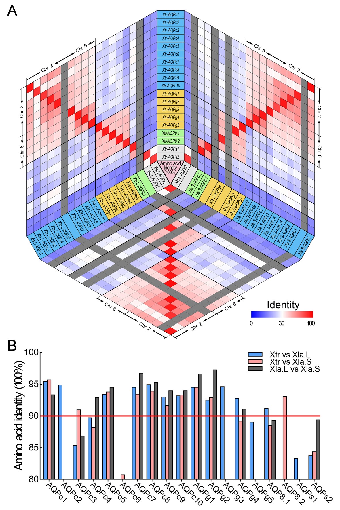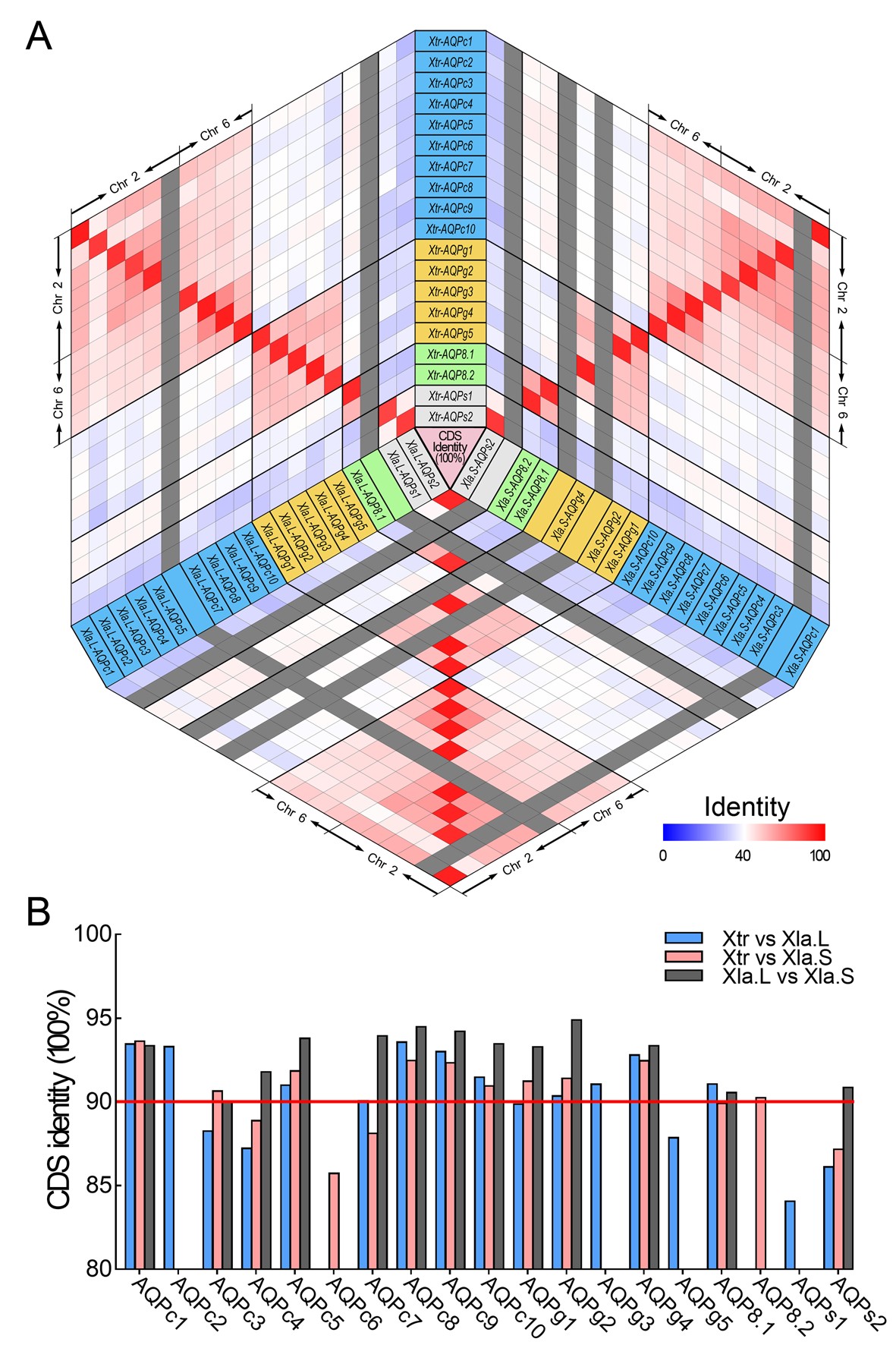 Identities between the CDS encoding AQP genes in the homeologs of X. laevis and X. tropicalis genome. (A) Heatmap of the identities between the sequence of AQP CDS in Xla and Xtr genome. (B) Identity between the ortholog AQP genes in Xla and Xtr genome.