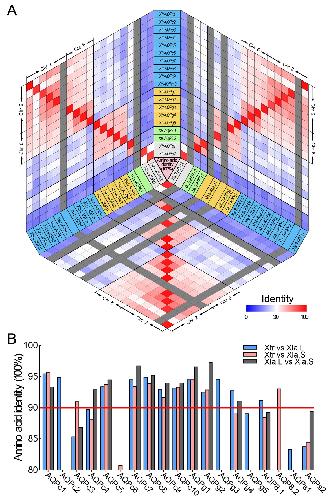 Identities between the amino acid sequences of AQP genes in the homeologs of X. laevis and X. tropicalis genome. (A) Heatmap of the identities between the amino acid sequence of AQP in Xla and Xtr genome. (B) Identity of the amino acid sequences between the ortholog AQPs in Xla and Xtr genome.