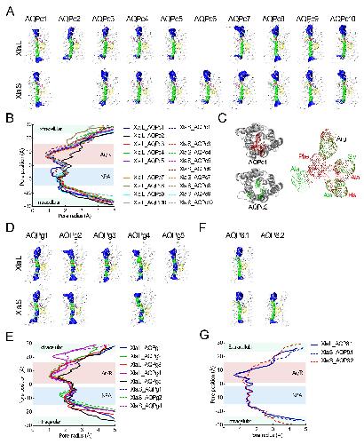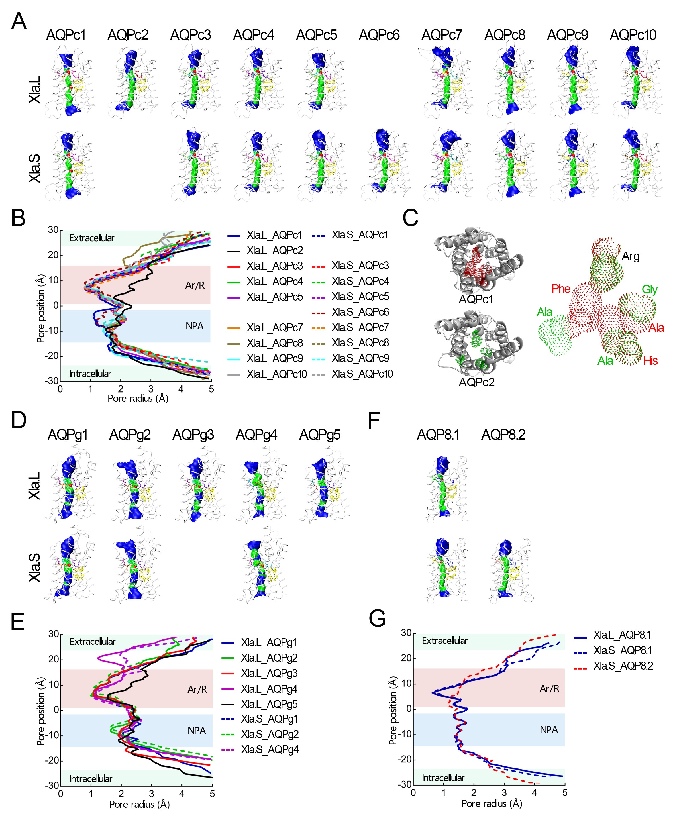 Pore pattern analyses of the AQPs in X. laevis genome. (A) Inner surface of the AQP proteins that clustered into C-AQP subfamily in Xla genome. (B) Individual diameter profiles of the AQP protein channel that clustered into C-AQP subfamily. (C) Comparison of the structure of the Ar/R region between AQPc1 and AQPc2. (D) Inner surface of the AQP proteins that clustered into AQGP subfamily in Xla genome. (E) Individual diameter profiles of the AQP protein channel that clustered into AQGP subfamily. (F) Inner surface of the AQP proteins that clustered into AQP-8 subfamily in Xla genome. (G) Individual diameter profiles of the AQP protein channel that clustered into AQP-8 subfamily.
