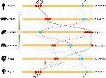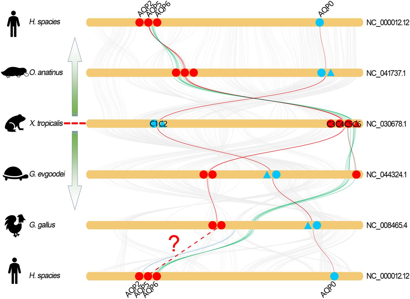 Fig 5. Collinearity relationship between the orthologs from AQPc1 to -c6 in different species. The round-corner rectangles filled in yellow represent the conserved regions of the chromosomes in different species. The words behind the round-corner rectangles represent the number of chromosomes. The circles filled in blue represent the conserved Mip protein. The triangles filled in blue represent the abnormal C-AQPs that neighbor localized beside Mip. The circles filled in red represent the orthologs of AQPc3 to -c5. The triangle filled in red represent the orthologs of AQPc6. The red curves represent the linkages between AQP orthologs. The green curves represent the linkages of the inverted region