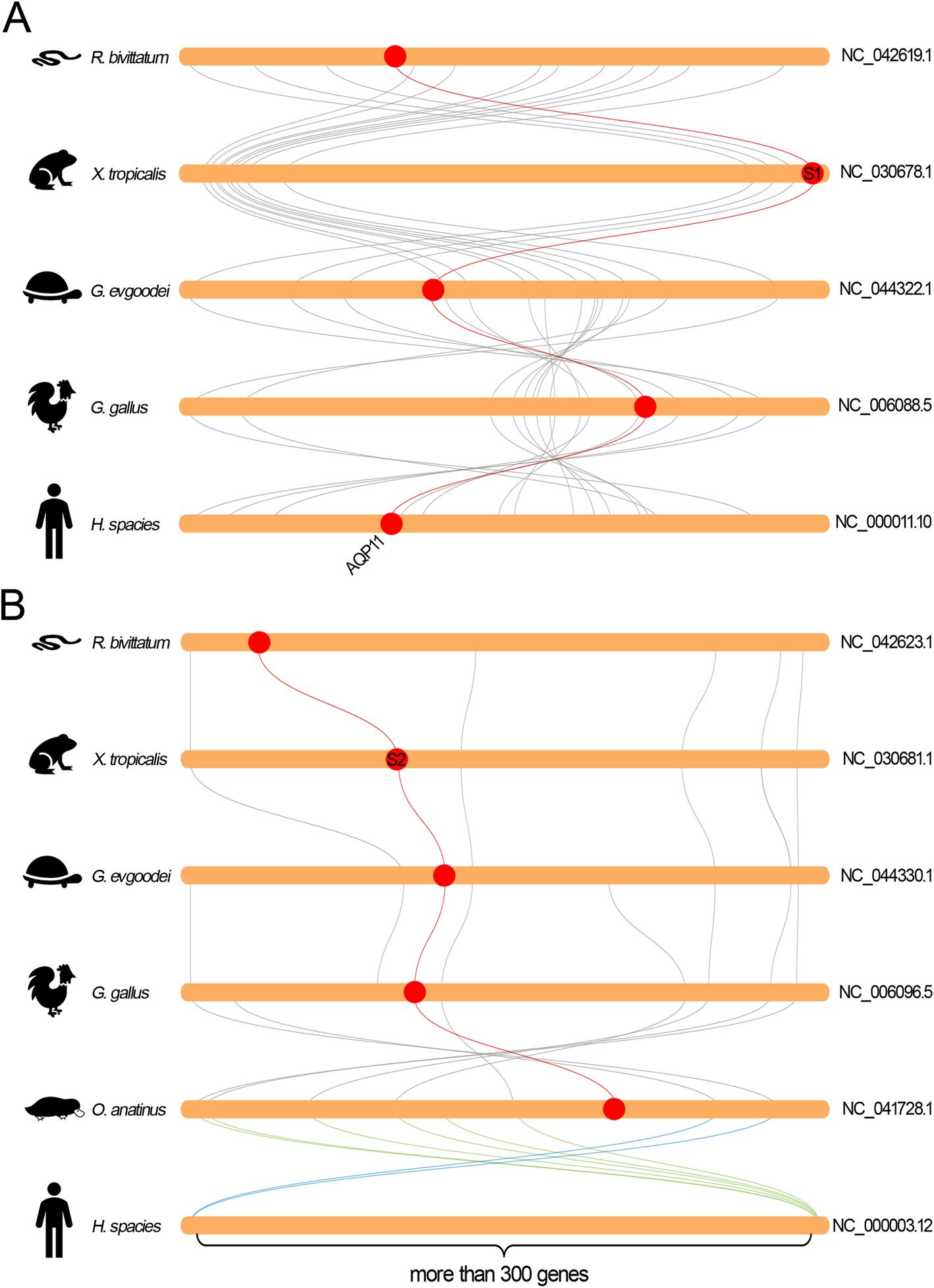 Fig. 8 Collinearity relationship between the orthologs in AQGP subfamily in different species. a Collinearity analysis of AQPg1 and -g2 orthologs. b Collinearity analysis of AQPg4 orthologs. The round-corner rectangles filled in yellow represent the conserved regions of the chromosomes in different species. The words behind the round-corner rectangles represent the number of chromosomes. The circles filled in red represent the AQP orthologs appeared in the corresponding chromosome. The red curves represent the linkages between the AQP orthologs. The blue stars represent the inserted gene between the orthologs of AQPg1 and -g2. The blue curve represents the linkage between the inserted gene