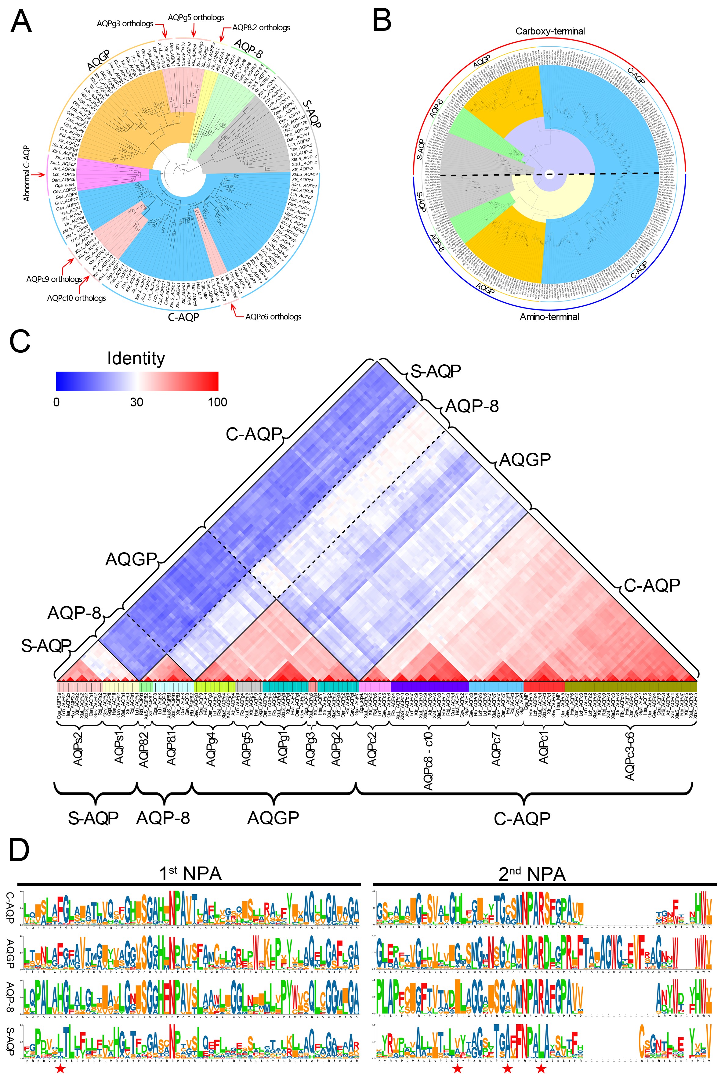 Phylogenetic analysis of the AQP genes in vertebrates. (A) Neighbor-Joining based phylogenetic tree of the AQP genes in different vertebrates. (B) Maximum likelihood based phylogenetic tree of the amino terminal and carboxy terminal of the AQP protein sequences in different vertebrates. The AQP families were distinct separated into four clades (marked with different colors), representing the four subfamilies respectively. (C) Identities between the amino acid sequences of AQP genes in different vertebrates. (D) The conserved amino acids in the two NPA motifs. The protein sequences were collected from the following species: Latimeria chalumnae (Lch), Rhinatrema bivittatum (Rbi), Xenopus laevis (Xla), Xenopus tropicalis (Xtr), Gopherus evgoodei (Gev), Gallus gallus (Gga), Ornithorhynchus anatinus (Oan), Homo sapiens (Hsa).