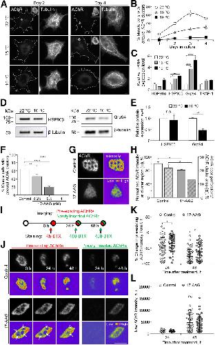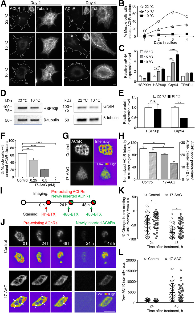 Figure 1. Temperature stress-modulated expression and pharmacological inhibition of HSP90 regulate the formation and stability of aneural AChR clusters. A, Representative images showing the inhibition of aneural AChR cluster formation in cultured Xenopus muscle cells treated with lower temperatures. Tubulin immunostaining indicated that cytoskeletal structures were largely unaffected in muscle cells cultured at different temperatures, ranging from 10â22°C. B, Quantification showing the percentage of cultured muscle cells with bottom aneural AChR clusters at different culturing temperatures over 4âd; nâ= 150 cells in each condition from three independent experiments. C, Quantification showing the relative mRNA levels of HSP90α, HSP90β, Grp94, and TRAP-1 in 2-d-old Xenopus muscle cells cultured at different temperatures; nâ=â3 independent experiments. D, E, Western blot analysis (D) and quantification (E) showing the protein expression level of HSP90β and Grp94 in Xenopus muscle cells cultured at 22°C or 10°C for 2âd. β-Tubulin was used as the loading control for normalization. F, Quantification showing the dose-dependent effects of 17-AAG on aneural AChR cluster formation in cultured Xenopus muscle cells; nâ= 191 (Control), nâ= 198 (0.25 nm 17-AAG), nâ= 199 (0.5 nm 17-AAG), and nâ= 200 (1 nm 17-AAG) muscle cells from four independent experiments. G, Representative images showing the organization and intensity of aneural AChR clusters in response to 17-AAG treatment. 8-bit pseudo-color images highlight the relative fluorescence intensity of AChR clusters in different conditions. H, Quantification showing the effects of 17-AAG on the intensity and complexity of aneural AChR clusters; nâ=â55 (Control) and nâ= 44 (17-AAG) muscle cells from three independent experiments for fluorescence intensity measurement (left y-axis); nâ=â76 (Control) and nâ= 48 (17-AAG) muscle cells from four independent experiments for cluster complexity measurement (right y-axis). I, Schematic diagram illustrating the differential labeling procedure to identify preexisting (red) and newly inserted (green) AChRs with BTX conjugated with different fluorophores. J, Representative sets of time-lapse images showing the topological changes and fluorescence intensity of pre-existing (left panels) and newly inserted (right panels) AChRs at aneural clusters in control (top panels) or 17-AAG-treated (bottom panels) muscle cells. Arrows indicate the progressive reduction of perforated area in aneural AChR clusters. 8-bit pseudo-color images highlight the change in the fluorescence intensity of the same aneural AChR clusters over 48 h with or without 17-AAG treatment. K, L, Individual value plots showing the percentage change in the fluorescence intensity of pre-existing (K) and newly inserted (L) AChRs in the same aneural AChR clusters at different time-points between control and 17-AAG-treated cells; nâ=â46 (Control) and nâ= 41 (17-AAG) muscle cells from three independent experiments. Scale bars: 10âμm. Data are shown as mean ± SEM (B, C, E, F, H) or mean ± SD (K, L). Two-way ANOVA with Tukeyâs multiple comparisons test (B, C), Studentâs t test (E, H), one-way ANOVA with Tukeyâs multiple comparison test (F), and two-way ANOVA with Sidakâs multiple comparisons test (K, L). *, **, and **** represent pââ¤â0.05, 0.01, and 0.0001, respectively. n.s.: non-significant.