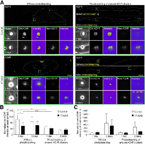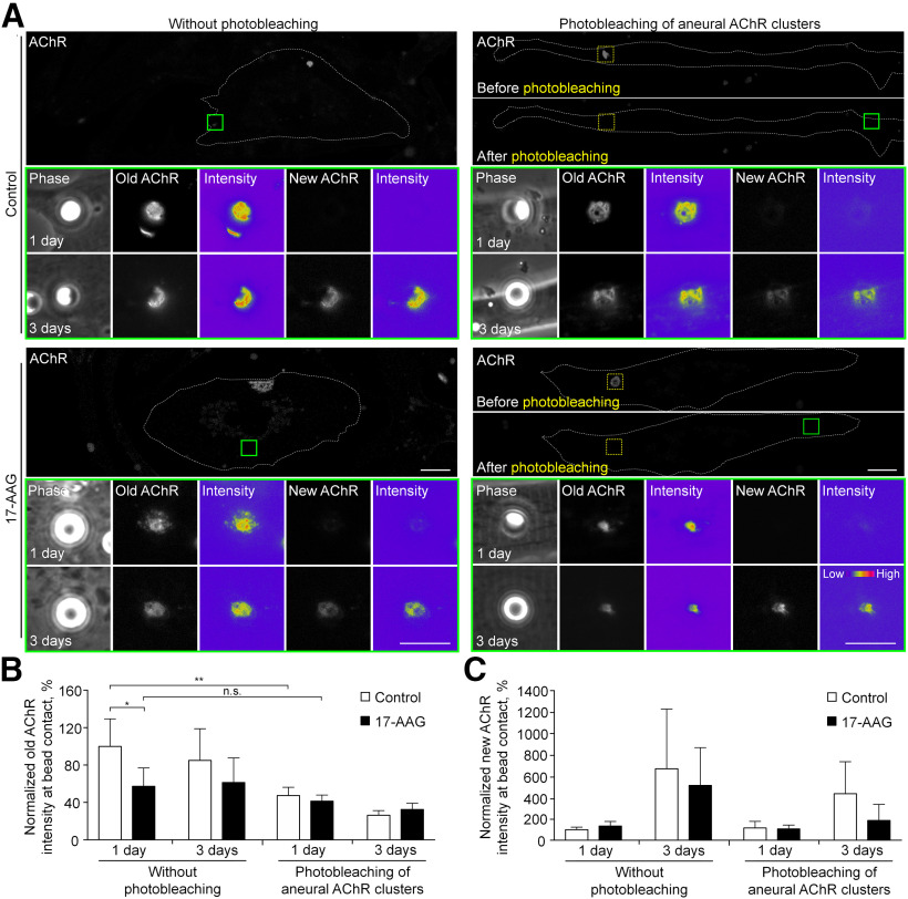Figure 2. HSP90 regulates AChR recruitment from aneural clusters to agrin-induced clusters. A, Representative images showing the differential contribution of diffuse and aneurally clustered AChRs to agrin bead-induced synaptic AChR clusters in control or 17-AAG-treated muscle cells using laser-based photobleaching approach. Green boxes indicate the magnified view of muscle cells with agrin bead contacts at different time-points for clarity. Yellow dotted-line boxes indicate the photobleaching region of aneural AChR clusters before agrin bead stimulation. Dotted lines highlight the periphery of muscle cells. 8-bit pseudo-color images highlight the relative fluorescence intensity of preexisting (old) and newly inserted (new) AChR signals in muscle cells contacted by agrin beads for 1 and 3âd. B, C, Quantification showing the fluorescence intensity of preexisting (B) and newly inserted (C) AChR signals at agrin bead-muscle contacts in control or 17-AAG-treated muscle cells, either with or without photobleaching of aneural AChR clusters before agrin bead stimulation; nâ=â11 (control, without photobleaching), nâ= 16 (control, photobleaching of aneural AChR clusters), nâ= 17 (17-AAG-treated, without photobleaching), and nâ= 21 (17-AAG-treated, photobleaching of aneural AChR clusters) muscle cells from three independent experiments. Scale bars: 10âμm. Data are shown as mean ± SEM. Two-way ANOVA with Tukeyâs multiple comparisons test. * and ** represent pââ¤â0.05 and 0.01, respectively. n.s.: non-significant.