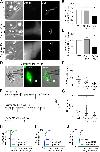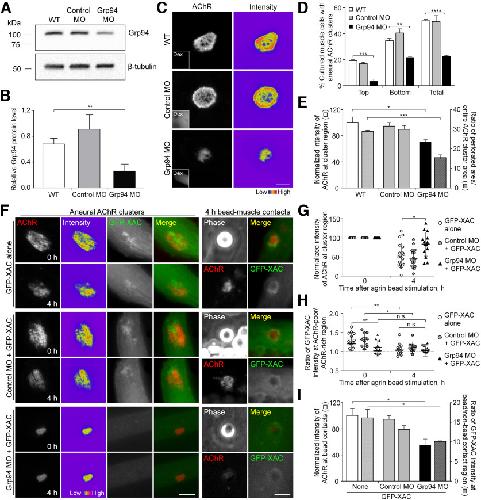 Figure 3. Grp94 knock-down inhibits agrin bead-induced AChR clustering by modulating ADF/cofilin localization. A, B, Western blot analysis (A) and quantification (B) showing the expression level of Grp94 in WT, Control MO, and Grp94 MO embryos. β-Tubulin was used as the loading control for normalization. C, Representative images showing the intensity and complexity of aneural AChR clusters in response to Grp94 knock-down. 8-bit pseudo-color images highlight the relative fluorescence intensity of AChR clusters in control versus Grp94 knock-down muscle cells. Insets show the fluorescent dextran (Dex) signals, indicating the presence of MO. D, Quantification showing the effects of MO-mediated Grp94 knock-down on the formation of aneural AChR clusters in cultured muscles; nâ=â150 (WT), nâ= 143 (Control MO), and nâ= 150 (Grp94 MO) muscle cells from three independent experiments. E, Quantification showing the effects of MO-mediated Grp94 knock-down on the intensity and complexity of aneural AChR clusters; nâ=â64 (WT), nâ= 47 (Control MO), and nâ= 52 (Grp94 MO) muscle cells from four independent experiments for fluorescence intensity measurement (left y-axis); nâ=â44 (WT), nâ= 42 (Control MO), and n = 44 (Grp94 MO) muscle cells from four independent experiments for cluster complexity measurement (right y-axis). F, Representative sets of time-lapse images showing the effects of Grp94 knock-down on GFP-XAC localization in association with the dispersal of aneural AChR clusters (left panels) and with the formation of agrin bead-induced AChR clusters (right panels). 8-bit pseudo-color images highlight the change in fluorescence intensity of aneural AChR clusters after agrin bead stimulation for 4 h. G, H, Individual value plots showing the percentage change in the fluorescence intensities of AChRs (G) and GFP-XAC (H) in the same aneural AChR clusters among different conditions after agrin bead stimulation for 4 h; nâ=â12 (GFP-XAC alone), nâ= 9 (Control MO + GFP-XAC), and nâ= 11 (Grp94 MO + GFP-XAC) muscle cells from three independent experiments. I, Quantification showing the effects of Grp94 knock-down on agrin bead-induced AChR clustering (left y-axis) and GFP-XAC localization (right y-axis); nâ=â24 (GFP-XAC alone), nâ= 24 (Control MO + GFP-XAC), and nâ= 21 (Grp94 MO + GFP-XAC) muscle cells from four independent experiments. Scale bars: 5âμm. Data are shown as mean ± SEM (B, D, E, I) or mean ± SD (G, H). One-way ANOVA with Dunnettâs multiple comparisons test (B, E), two-way ANOVA with Tukeyâs multiple comparisons test (D), two-way ANOVA with Sidakâs multiple comparison test (G, H) and one-way ANOVA with Turkeyâs multiple comparison test (I). *, **, ***, and **** represent pââ¤â0.05, 0.01, 0.001, and 0.0001, respectively. n.s.: non-significant.