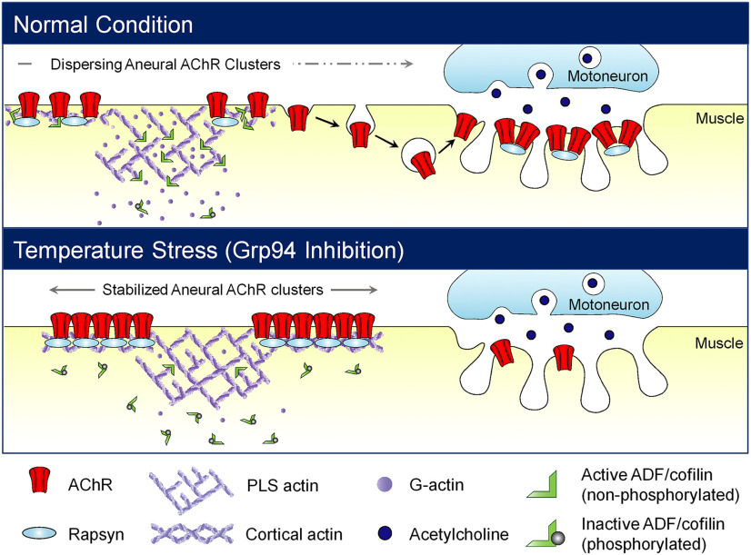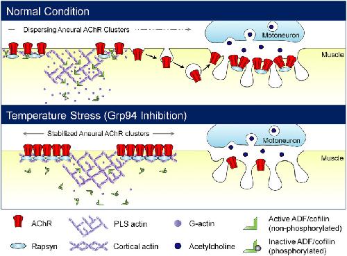 Figure 6. Temperature stress-induced Grp94 inhibition affects AChR recruitment from aneural to synaptic clusters by modulating ADF/cofilin phosphorylation and activity. To allow AChR redistribution during neuromuscular synaptogenesis, modulation of actin dynamics at the cell cortex and at the PLS are required for mobilizing AChR molecules and facilitating vesicular trafficking of AChR molecules at aneural clusters, respectively. Our findings suggest that temperature stress-induced Grp94 inhibition promotes phosphorylation or suppress dephosphorylation of ADF/cofilin at perforated and AChR-rich regions of aneural clusters, thereby stabilizing them against agrin-induced dispersal and recruitment to the postsynaptic sites.