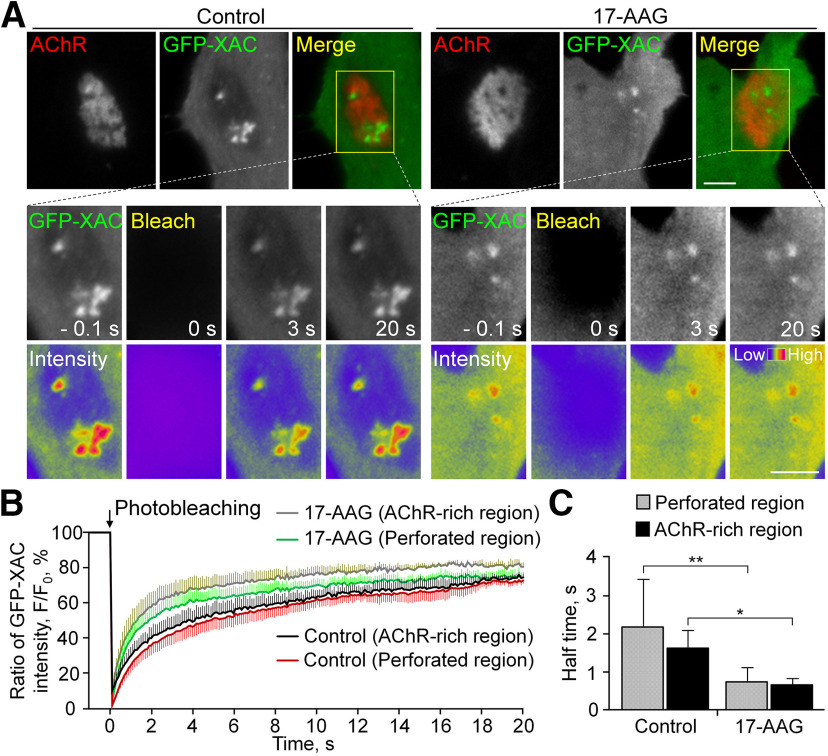 Figure 4. HSP90 inhibition accelerates ADF/cofilin turnover at different regions of aneural AChR clusters. A, Representative time-lapse TIRF images showing the fluorescence recovery of GFP-XAC signals after photobleaching the region of aneural AChR clusters (yellow rectangles, which are magnified in bottom rows with multiple timepoints) in control or 17-AAG-treated muscle cells. 8-bit pseudo-color images highlight the relative fluorescence intensity of GFP-XAC signals. B, C, Quantification showing the FRAP curves (B) and the calculated recovery half-time (C) of GFP-XAC signals at perforated and AChR-rich regions within aneural AChR clusters in control versus 17-AAG-treated muscle cells; nâ=â12 (Control) and nâ= 7 (17-AAG) muscle cells from three independent experiments. Scale bars: 5âμm. Data are shown as mean ± SEM. Studentâs t test. * and ** represent pââ¤â0.05 and 0.01, respectively.