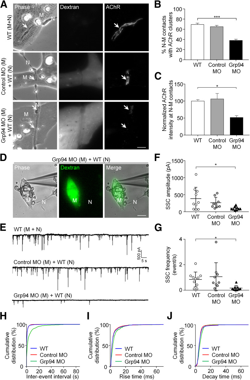 Figure 5. Postsynaptic Grp94 knock-down impairs synaptic structures and functions at developing NMJs. A, Representative images showing the effects of muscle Grp94 knock-down on nerve-induced AChR clustering. Fluorescent dextran signals indicate the presence of MO. Arrows indicate sites of nerve-muscle contacts. B, C, Quantification showing the effects of muscle Grp94 knock-down on the percentage of nerve-muscle contacts with AChR clusters (B) and the fluorescence intensity of nerve-induced AChR clusters (C) in 1-d-old Xenopus nerve-muscle co-cultures; nâ=â150 (WT), nâ= 146 (Control MO), and nâ= 191 (Grp94 MO) nerve-muscle contacts from three independent experiments for quantifying the percentage of nerve-muscle contacts with synaptic AChR clusters (B); nâ=â33 (WT), nâ= 31 (Control MO), and nâ= 33 (Grp94 MO) nerve-muscle contacts from three independent experiments for measuring AChR fluorescence intensity (C). D, Representative images showing the whole-cell patch-clamp recording on a Grp94 MO muscle cell innervated by a WT spinal neuron. Fluorescent dextran signals indicate the presence of MO. E, Representative electrophysiological recording traces of SSCs recorded from WT, Control MO, or Grp94 MO muscles that were innervated by WT spinal neurons. F, G, Quantification showing the effects of muscle Grp94 knock-down on the amplitude (F) and frequency (G) of SSCs. HâJ, Cumulative distribution plots of the inter-event interval (H), 10â90% rise time (I), and decay time (J) of SSCs recorded from WT, Control MO, or Grp94 MO muscles innervated by WT spinal neurons. nâ=â10 (WT), nâ= 9 (Control MO), and nâ= 9 (Grp94 MO) nerve-muscle pairs from three independent experiments (FâJ). Scale bars: 10âμm. âMâ: muscle; âNâ: neuron. Data are represented as mean ± SEM (B, C) and mean ± SD (F, G). One-way ANOVA with Tukeyâs multiple comparisons test (B, C). KruskalâWallis ANOVA test with Dunn's multiple comparison test (F, G). * and *** represent pââ¤â0.05 and 0.001, respectively.