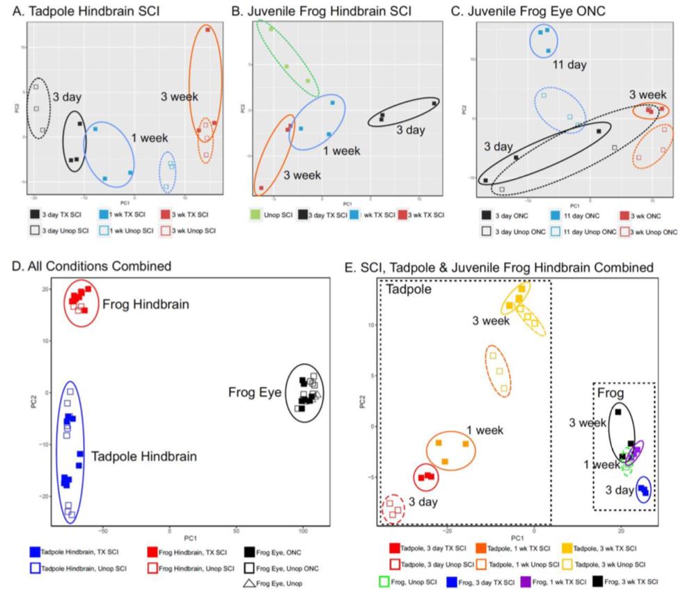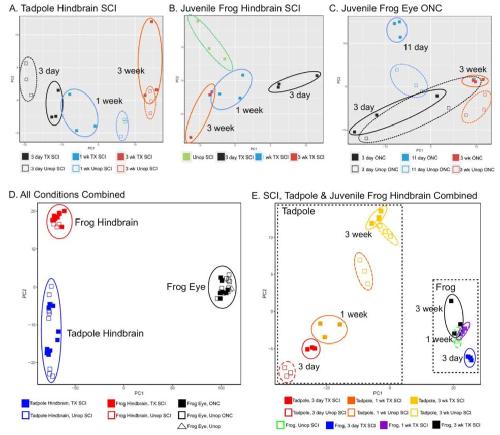 Additional File 5 Scatterplot representation of the Principal Component Analyses (PCA) of gene expression profiles. Ellipses group biological replicates for each indicated condition (experimentals, solid squares; controls, empty squares), indicating variation among samples. AïC, PCA of tadpole and juvenile hindbrain after spinal cord injury (SCI), and of juvenile frog after optic nerve crush (ONC), respectively. In C, expression profiles from the operated eye were compared with those of the contralateral, unoperated eyes within the same animals. D, PCA of all 17 conditions combined, supporting the tissue-specific nature of gene expression profiles. Conditions were the same as in AïC, except that data from eyes of animals receiving no injury was included (open triangles, Frog Eye, Unop). E, PCA of tadpole and juvenile frog hindbrain samples after spinal cord injury, supporting the conclusion that the differences in gene expression profiles between the time points at which numbers of differentially expressed genes reached their peaks (3 days in juvenile frog hindbrain and 1 week in tadpole hindbrain) were more than just a kinetic difference in the timing of expression of the same differentially expressed genes. Abbreviations: ONC, optic nerve crush; PC1, principal component axis 1; PC2, Principal Component axis 2; SCI, spinal cord injured; TX, spinal cord transected; Unop ONC ï unoperated eye, contralateral to the operated eye; Frog Eye, Unop ï eyes from unoperated animals; wk, week. |