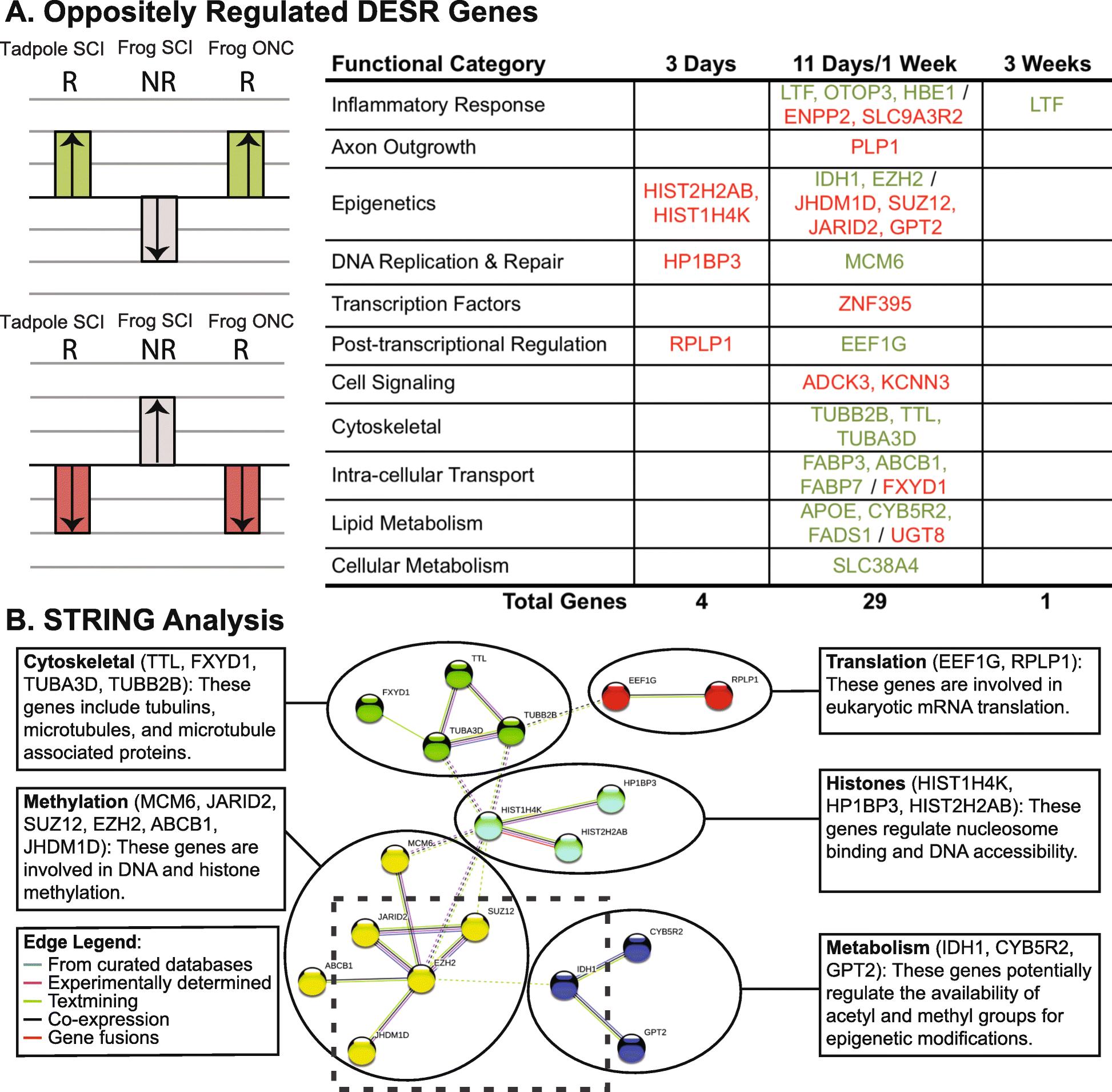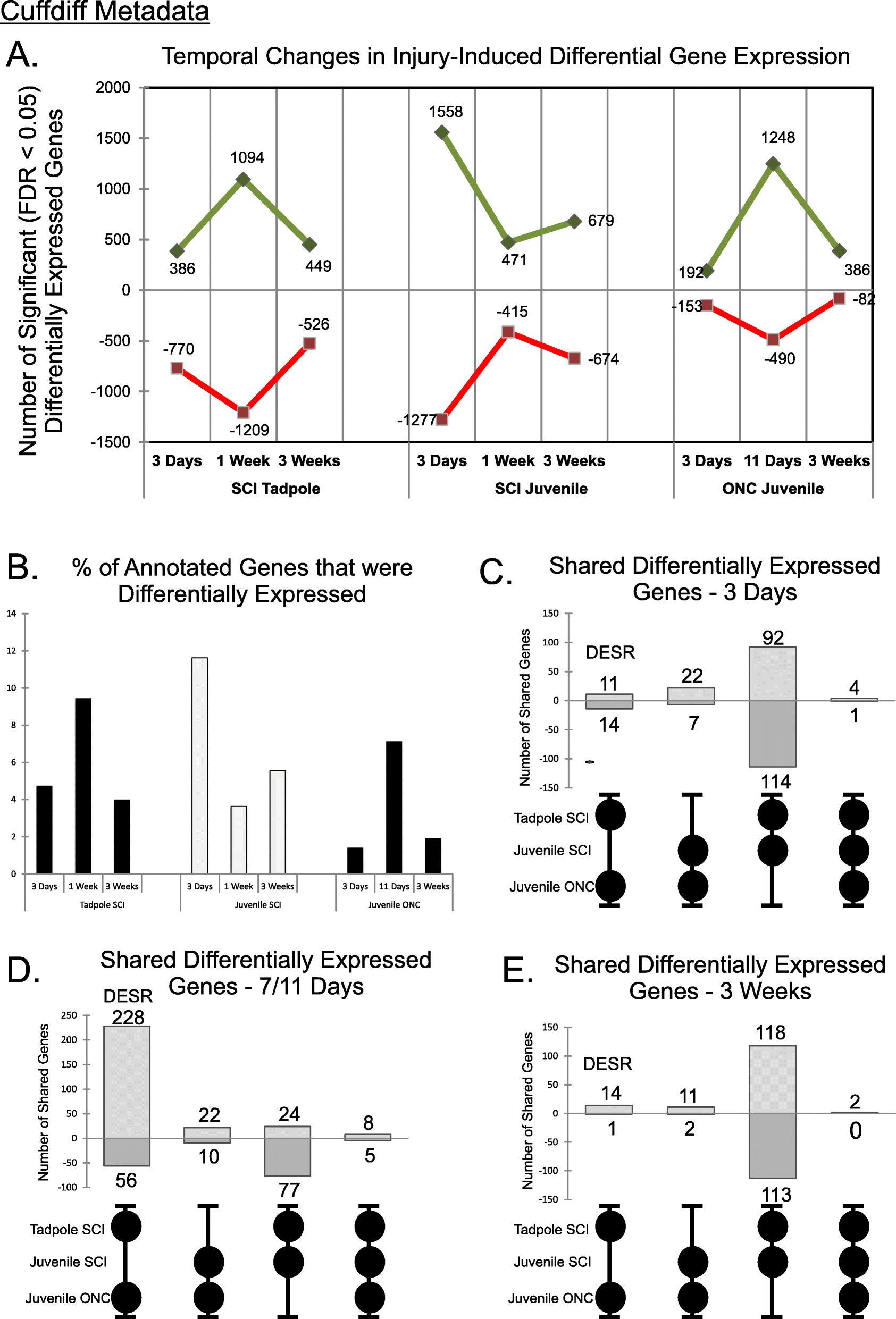 BACKGROUND: The South African claw-toed frog, Xenopus laevis, is uniquely suited for studying differences between regenerative and non-regenerative responses to CNS injury within the same organism, because some CNS neurons (e.g., retinal ganglion cells after optic nerve crush (ONC)) regenerate axons throughout life, whereas others (e.g., hindbrain neurons after spinal cord injury (SCI)) lose this capacity as tadpoles metamorphose into frogs. Tissues from these CNS regions (frog ONC eye, tadpole SCI hindbrain, frog SCI hindbrain) were used in a three-way RNA-seq study of axotomized CNS axons to identify potential core gene expression programs for successful CNS axon regeneration. RESULTS: Despite tissue-specific changes in expression dominating the injury responses of each tissue, injury-induced changes in gene expression were nonetheless shared between the two axon-regenerative CNS regions that were not shared with the non-regenerative region. These included similar temporal patterns of gene expression and over 300 injury-responsive genes. Many of these genes and their associated cellular functions had previously been associated with injury responses of multiple tissues, both neural and non-neural, from different species, thereby demonstrating deep phylogenetically conserved commonalities between successful CNS axon regeneration and tissue regeneration in general. Further analyses implicated the KEGG adipocytokine signaling pathway, which links leptin with metabolic and gene regulatory pathways, and a novel gene regulatory network with genes regulating chromatin accessibility at its core, as important hubs in the larger network of injury response genes involved in successful CNS axon regeneration. CONCLUSIONS: This study identifies deep, phylogenetically conserved commonalities between CNS axon regeneration and other examples of successful tissue regeneration and provides new targets for studying the molecular underpinnings of successful CNS axon regeneration, as well as a guide for distinguishing pro-regenerative injury-induced changes in gene expression from detrimental ones in mammals.