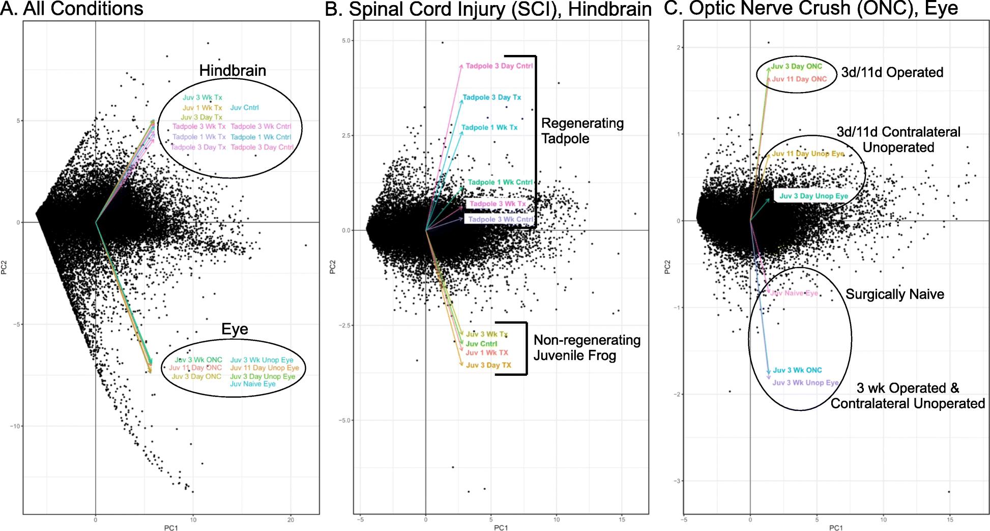 Fig. 3 Eigenvector representation of the Principal Component Analyses (PCA) of gene expression profiles. Eigenvectors depict relative degrees of similarity among data sets, as indicated. Black points represent individual genes plotted against the principal axes of similarity (PC1, PC2). a, PCA of all 17 experimental conditions and controls. b, PCA of SCI hindbrain samples and their unoperated controls. c, PCA of ONC operated eye expression profiles, as well as those of their paired, contralateral unoperated control eyes and eyes of uninjured animals (surgically naive). Abbreviations: Cntrl, control hindbrain; Juv, juvenile (1â3âmonth post-metamorphic) frog; ONC, optic nerve crush; PC1, principal component axis 1; PC2, Principal Component axis 2; SCI, spinal cord injured; Tx, spinal cord transection; Unop, unoperated eye, contralateral to the ONC; Wk, week. Additional_File5_PCA_Scatterplot.pdf shows PCA scatterplots |