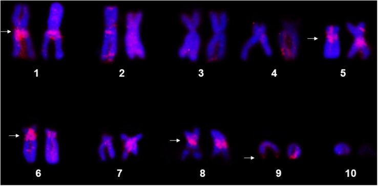 FIGURE 1. Metaphase chromosomes of Pipa carvalhoi submitted to fluorescent in situ hybridization with the histone H3 probe. The chromosome pairs with hybridization signals detected in both chromatids of each homolog are indicated by the arrowheads.