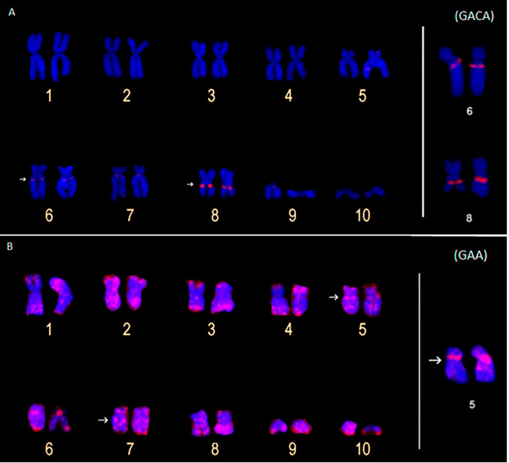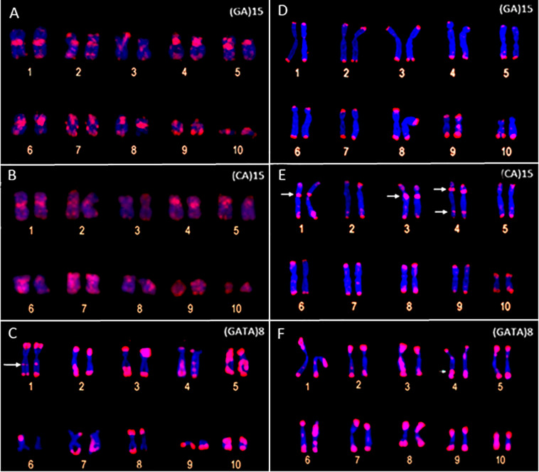 (D–F) submitted to fluorescent in situ hybridization with probes for the microsatellite repeat motifs (GA)15