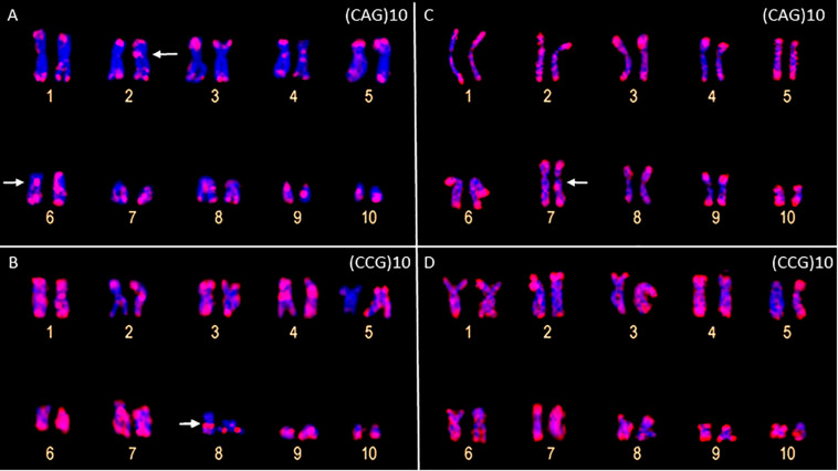(C,D) submitted to fluorescent in situ hybridization with probes for the microsatellite repeat motifs (CAG)10