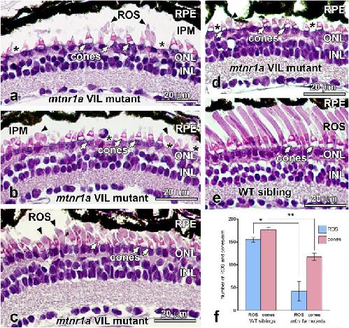 Figure 5. Rods are dystrophic in stage 54â56 (4-month-old) F2 heterozygous but not homozygous mtnr1a VIL mutant tadpoles (nâ=â5). F2 heterozygous and homozygous tadpoles were generated by crossing two F1 VIL mutant heterozygotes. (a) WT siblings of F2 mutants exhibit healthy-appearing rod and cone photoreceptors. (b) Central retinas of VIL mutant heterozygous tadpoles display ROS dystrophy and abnormal distribution of RPE cells, whereas cones appear relatively normal (white arrows). (c) Retinas of homozygous VIL mutant siblings display morphologies similar to WT siblings. (d) Quantitative measurements of rod dystrophy in X. tropicalis retinas show that rod outer segment (ROS) length is diminished significantly by 24% in VIL heterozygous 4-month-old tadpoles, compared to WT when analyzed by an unpaired two-tailed t-test (*; pâ=â0.0267, nâ=â3). The 15% decline in ROS length in VIL homozygous tadpoles compared to WT was statistically insignificant (pâ=â0.0867, nâ=â3). No significant differences in rod (i.e., ROS) or cone abundance were observed among the three genotype groups. Measurements were made of digital images of groups of 4-month-old tadpoles represented in aâc. Error bars indicate standard error of the mean. RPE retinal pigment epithelium, ROS rod outer segments, ONL outer nuclear layer, INL inner nuclear layer, cone inner segments; white arrows. Magnification barsâ=â20 µm. |
