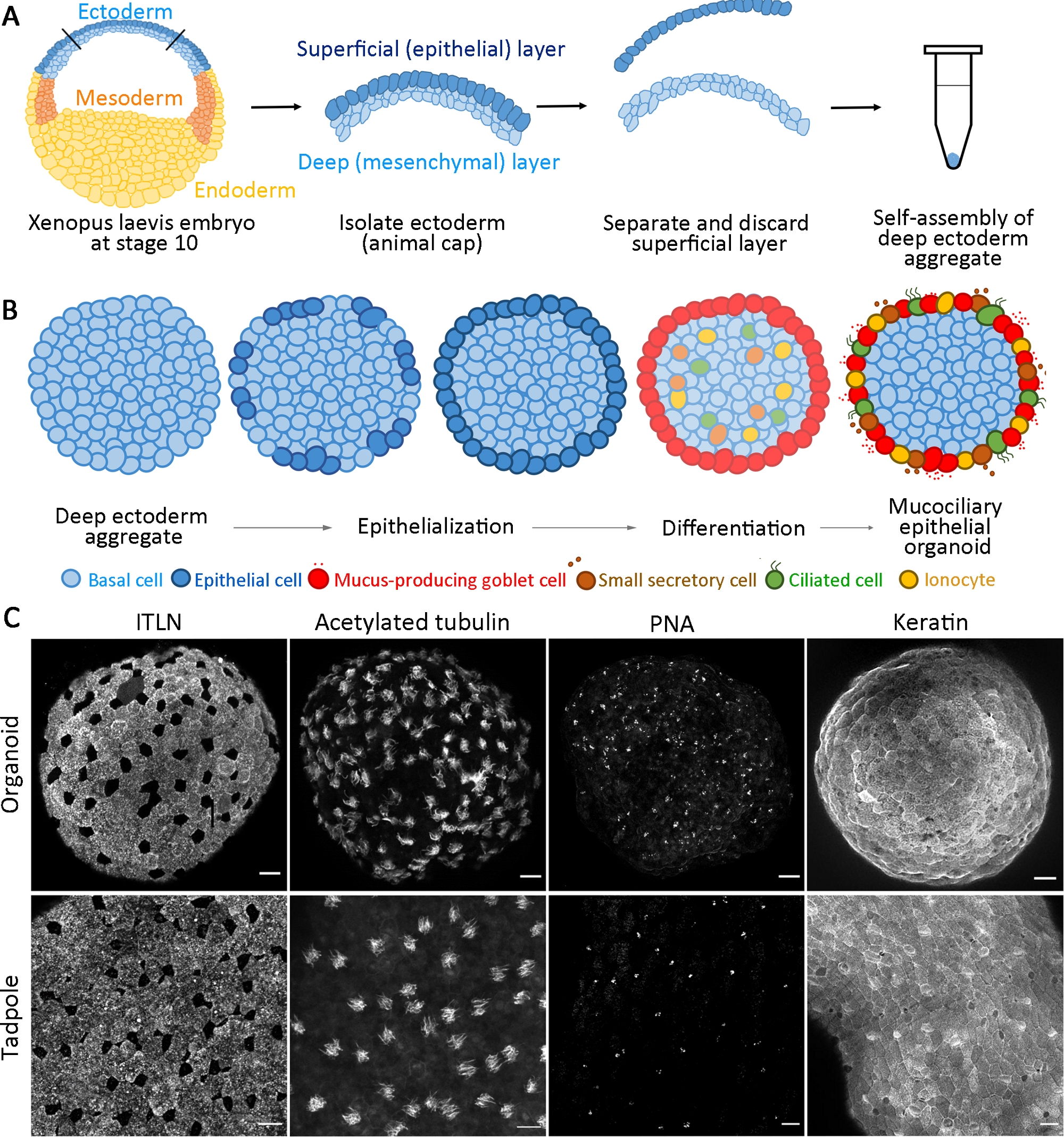 Mucociliary epithelium provides the first line of defense by removing foreign particles through the action of mucus production and cilia-mediated clearance. Many clinically relevant defects in the mucociliary epithelium are inferred as they occur deep within the body. Here, we introduce a tractable 3D model for mucociliary epithelium generated from multipotent progenitors that were microsurgically isolated from Xenopus laevis embryos. The mucociliary epithelial organoids are covered with newly generated epithelium from deep ectoderm cells and later decorated with distinct patterned multiciliated cells, secretory cells, and mucus-producing goblet cells that are indistinguishable from the native epidermis within 24 h. The full sequences of dynamic cell transitions from mesenchymal to epithelial that emerge on the apical surface of organoids can be tracked by high-resolution live imaging. These in vitro cultured, self-organizing mucociliary epithelial organoids offer distinct advantages in studying the biology of mucociliary epithelium with high-efficiency in generation, defined culture conditions, control over number and size, and direct access for live imaging during the regeneration of the differentiated epithelium.