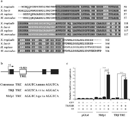 Fig. 2. The MTP18 domain of Mtfp1 is highly conserved and Xenopus tropicalis Mtfp1 promoter is regulated by TR via an intronic TRE in vivo. (a) Amino acid alignment of Mtfp1 from X. tropicalis, X. laevis, H. sapiens and M. musculus. The boxed region is the MTP18 domain. Shaded amino acids indicate conserved residues. (b) Schematic diagram of the Mtfp1gene with a putative TRE (white box) in the first intron. Gray box shows the putative 5′ UTR and black boxes are exons. The putative TRE is located at + 371 bp from the putative transcription start site. The TRE of the TRβ gene is shown for comparison. (c) Activation of the Mtfp1 promoter by liganded TR in the reconstituted oocytes. The reporter construct had the Mtfp1 promoter, including the TRE in the first intron, driving the expression of firefly luciferase. The internal control was the Renilla luciferase reporter phRG-TK vector. pGL4 was a negative control for promoter activity, and TRβ promoter construct was a positive T3-response promoter control. GFP was used as a control for TR/RXR mRNA. The oocytes were injected with indicated mRNA and reporter construct and harvested for luciferase assay (n = 3). The data are shown mean ± S.E.M. (***P ≤ 0.005).