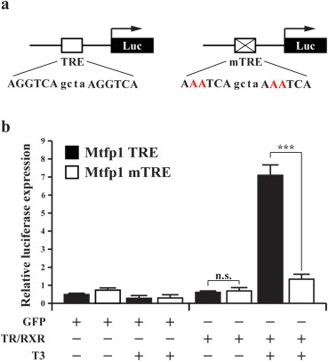 Fig. 3. TR activates Mtfp1 transcription though putative TRE when T3 is present. (a) Schematic diagrams of the Mtfp1 promoter construct containing wild type TRE (Mtfp1 TRE) or a mutant TRE (Mtfp1 mTRE). The TRE sequences are shown in capital letters with the mutated position in red. (b) The promoter with wild type Mtfp1 TRE but not mTRE is activated by T3 in the presence of T3 when TR and RXR were expressed in Xenopus laevis oocytes. The oocytes were injected as indicated and harvested for luciferase assay (n = 3). The data are shown mean ± S.E.M. (***P ≤ 0.005; n.s. not significant).