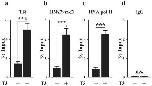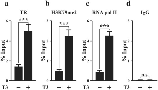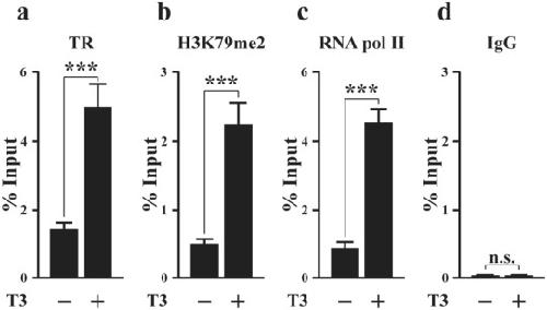 Fig. 4. The TRE in the first intron of Mtfp1 gene is bound by TR in the intestine of premetamorphic tadpoles treated with T3, accompanied by increased RNA polymerase II recruitment and histone H3K79 methylation. ChIP assay were done on the intestine of stage 54 tadpoles with or without treatment with T3 with the antibody against the antigen indicated on each panel or control IgG (n = 3). (a) TR binds the Mtfp1 TRE region in the intestine and T3 treatment increases this binding. (b) Di-methylation of histone H3K79, a transcription activation histone mark, is increased in the TRE region by T3 treatment. (c) The level of RNA polymerase II recruitment at TRE region of Mtfp1 is increased after T3 treatment. (d) The negative control IgG ChIP yields only background signals. The data are shown in mean ± S.E.M. (***P ≤ 0.005. n.s. not significant).