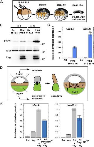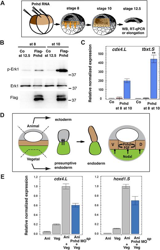Fig. 8. Pnhd cooperates with endogenous-inducing signals to promote mesoderm formation during gastrulation. (A) Schematic of the experiments presented in B,C. Mesoderm-inducing signals are indicated by orange arrows, and the cells receiving them are in light brown. Each animal blastomere of two-cell embryos received 1â ng of Pnhd RNA. Pnhd-expressing or control ectoderm explants were isolated at stage 8 or stage 10, as indicated. When the control embryos reached stage 12.5, the explants were lysed for immunoblotting with antibodies specific for pErk1 and Erk (B) and for RT-qPCR analysis of cdx4 and tbxt transcripts (C). (B) Erk is synergistically activated by Pnhd and endogenous signals in ectoderm explants isolated at stage 10. (C) Cooperative activation of mesodermal gene targets by Pnhd and endogenous signals in ectoderm dissected at stage 10. (D,E) Pnhd is required for mesoderm formation in response to endogenous-inducing signals. (D) Schematic of the experiment shown in E. Model for Pnhd function (right). Pnhd is activated in the marginal zone by Nodal and FGF signaling and functions within the newly induced mesodermal layer. D, dorsal mesoderm; V, ventral mesoderm. The green color indicates presumptive endoderm in the vegetal pole, the gray color indicates presumptive ectoderm at the animal pole, and the future mesoderm is represented by brown shading. (E) Pnhd is required for mesoderm formation in animal-vegetal conjugates. Pnhd MOsp-injected or control animal pole explants were combined with vegetal explants at stage 8. After culture until stage 11, levels of cdx4 and hoxd1 transcripts were determined in the conjugates by RT-qPCR. Data are mean±s.d. Significance was determined by an unpaired two-tailed Student's t-test. **P<0.01. |