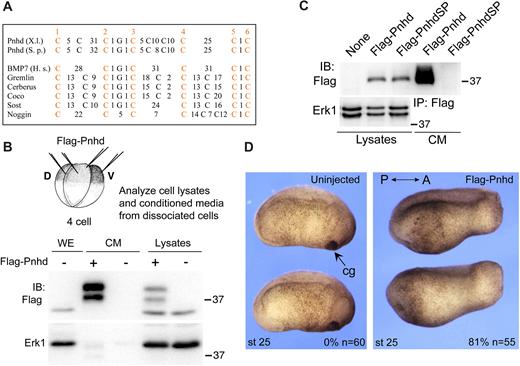 Fig. 1 Pnhd is a secreted proteinâthat promotesâposterior development. (A) Alignment of CK domains from Pnhd and other secreted proteins. Spacing is indicated by numbers of non-conserved amino acids between conserved cysteine residues. X.l., Xenopus laevis; S.p., Stegastes partitus; H.s., Homo sapiens. (B) Secretion of Pnhd by Xenopus gastrula cells. Four-cell embryos were injected with 0.5â ng of Flag-Pnhd RNA for each blastomere, cultured to the onset of gastrulation and dissociated to individual cells. Pnhd levels were compared in the media conditioned for 3â h and the corresponding cell lysates. (C) Pnhd is secreted by transfected HEK293Tcells. Deletion of the putative signal peptide in PnhdSP prevents secretion. (D) Head defects in embryos injected dorsally with 2â ng of pnhd RNA at the four-cell stage. Frequencies of embryos with head defects and their total number are indicated. The results are representative of more than five independent experiments. A, anterior; cg, cement gland; CM, conditioned medium; IB, immunoblot; IP, immunoprecipitation; P, posterior. |