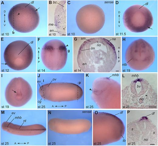 Fig. 2. Pnhd transcript localizationâat different developmental stages. WISH was carried out with albino embryos using pnhd antisense and sense RNA probes. (A) Vegetal view of a stage 10 embryo (dorsal is up). Arrowhead points to vegetal endoderm. (B) Cross-section of a stage 10 embryo. (C) Control embryo, stage 10 (sense probe). (D) Vegetal view of a stage 11.5 embryo (dorsal is up). (E) Vegetal view of a stage 12 embryo (dorsal side is up). Arrows in A,D,E indicate mesodermal expression. (F) Dorsal view of a stage 14 embryo (anterior is up). Arrowhead marks the neuroectoderm. (G) Cross-section of the embryo shown in F. (H) Anterior view of a stage 19 embryo (dorsal is up). (I) Posterior view of a stage 19 embryo (dorsal is up). Arrow indicates staining in the tailbud. (J) Side view of a stage 25 embryo. (K) Head of a stage 25 embryo (anterior is left). Arrowhead points to the signal in the superficial ectoderm cells that are dorsal to the cement gland. (L) Cross-section corresponding to the midbrain level of embryo in J. (M) Dorsal view of a stage 25 embryo. (N) Stage 25, control sense probe. (O) Lateral view of a stage 25 embryo tailbud. Anterior is to the left in J,K,M-O. (P) Transverse section of a stage 25 embryo corresponding to J and O. Dashed lines mark the approximate level of corresponding sections (indicated by bold letters). Dorsoventral (D/V) and anteroposterior (A/P) embryonic axes are indicated. Abbreviations: bc, blastocoel; bv, brain ventricle; cg, cement gland; df, dorsal fin; dl, dorsal blastopore lip; en, endoderm; ev, eye vesicle; lm, lateral mesoderm; me, mesoderm; mhb, midbrain-hindbrain boundary; ne, neuroectoderm; nt, neural tube; ntb, neural tube border; no, notochord; ov, otic vesicle; s, somites; sm, somitic mesoderm; tb, tailbud. Scale bars: 50â µm (B,G,L); 25â µm (P). |