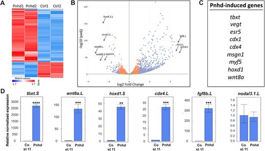 Fig. 4. RNA sequencing defines Pnhd target genes. (A) Heatmap of gene expression in the Pnhd-expressing and control uninjected animal pole cells that were cultured until stages 11 and 12. The duplicate samples are highly similar. (B) Volcano plot shows top genes upregulated by Pnhd. (C) Differentially expressed genes that are induced by Pnhd RNA (1.5â ng) in animal caps. The list was derived from the top 100 genes induced by Pnhd in four independent RNA-seq experiments. (D) qRT-PCR validation of Pnhd targets in animal caps. Data are mean±s.d. Significance was determined by an unpaired two-tailed Student's t-test. **P<0.01, ***P<0.001, ****P<0.0001. |