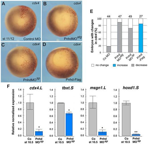 Fig. 5. Pnhd is required for mesodermâformation. (A-D) WISH validates changes in cdx4 expression in embryos with manipulated Pnhd levels in one half of each embryo. Red-gal was used as a β-galactosidase substrate (red) for lineage tracing of the injected area. Compare gene expression (dark staining) between the injected (red) and uninjected sides. (E) Quantification of changes in cdx4 RNA in Pnhd-depleted or overexpressing embryos. (F) RT-qPCR confirmation of the downregulation of cdx4, hoxd1, msgn1 and tbxt in stage 10.5 marginal zone explants depleted of pnhd. Data are mean±s.d. Significance was determined by an unpaired two-tailed Student's t-test. *P<0.05, **P<0.01. |
