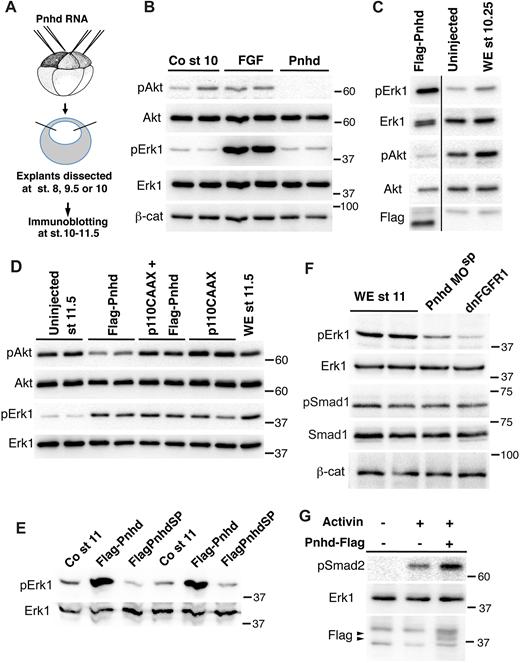 Fig. 7. Pnhd inhibits Akt, but activates Erk1. (A) Schematic of the experiments shown in B-D. Embryos were injected with RNAs encoding Flag-Pnhd (1.5 ng), p110CAAX (0.5 ng), or treated with FGF protein, as indicated. Ectoderm explants were dissected at stages 8, 9.5 or 10, and cultured until the desired stage for immunoblotting with indicated antibodies. (B) Comparison of Pnhd and FGF effects on blastula ectoderm. Pnhd inhibits Akt phosphorylation in ectoderm explants isolated at stage 8 and analyzed at stage 10. FGF has no effect on Akt, but activates Erk. (C) Pnhd inhibits Akt but induces Erk phosphorylation in ectoderm isolated at stage 9.5 and cultured until stage 10.25. This result has been obtained in at least ten experiments. The separator line serves to indicate that several irrelevant gel lanes have been omitted. (D) Pnhd-dependent stimulation of Erk is not affected by the Akt activator p110CAAX. (E) Erk1 phosphorylation in Pnhd-expressing embryos at stage 11. Embryos were injected with RNAs encoding Flag-Pnhd or Flag-PnhdSP (1.5 ng each). (F) Downregulation of Erk1 phosphorylation in lysates of stage 11 embryos injected with Pnhd MOsp. Embryos were injected with RNAs encoding dnFGFR1 (1.5 ng each) or 40 ng of Pnhd MOsp, as indicated. There are no detectable changes in β-catenin or phospho-Smad1. (G) Pnhd promotes Smad2 phosphorylation by Activin. Ectoderm explants were dissected from the injected embryos at stage 8 and cultured for 1 h with or without Activin. Immunoblot analysis with anti-pSmad2 antibodies is shown. Pnhd is detected by anti-Flag antibodies (arrowhead). Erk1 is a control for loading. WE, whole embryo controls in C,D,F. |