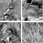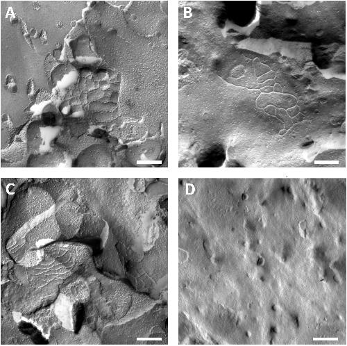 Figure 3. Freeze fracture electron microscopy. (A) Freeze fracture electron microscopy reveals tight junction protein cldn-5 as a meshwork of angular discontinous fibrils in rows in Xenopus laevis oocytes. (B) Freeze fracture electron microscopy reveals tight junction protein cldn-3 as a meshwork of rounded fibrils in X. laevis oocytes. (C) Freeze fracture electron microscopy of claudin-3 and claudin-5 coexpressing oocytes reveal fibrils that both bear properties of claudin-3 and claudin-5. (D) Water injected control oocytes have a smooth surface. Representative images of oocytes derived from three animals. Scale bar: 250 nm.