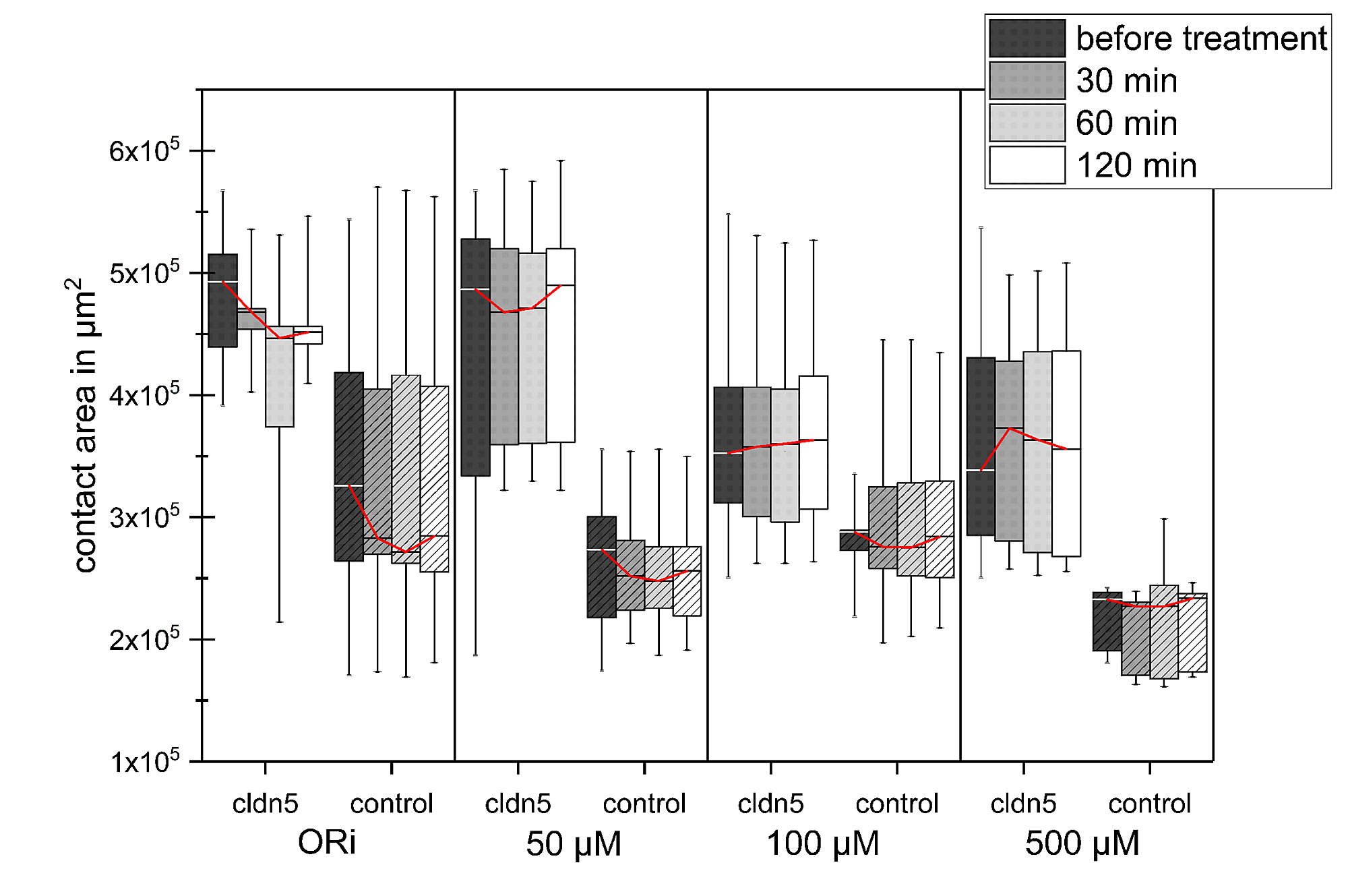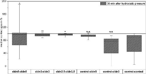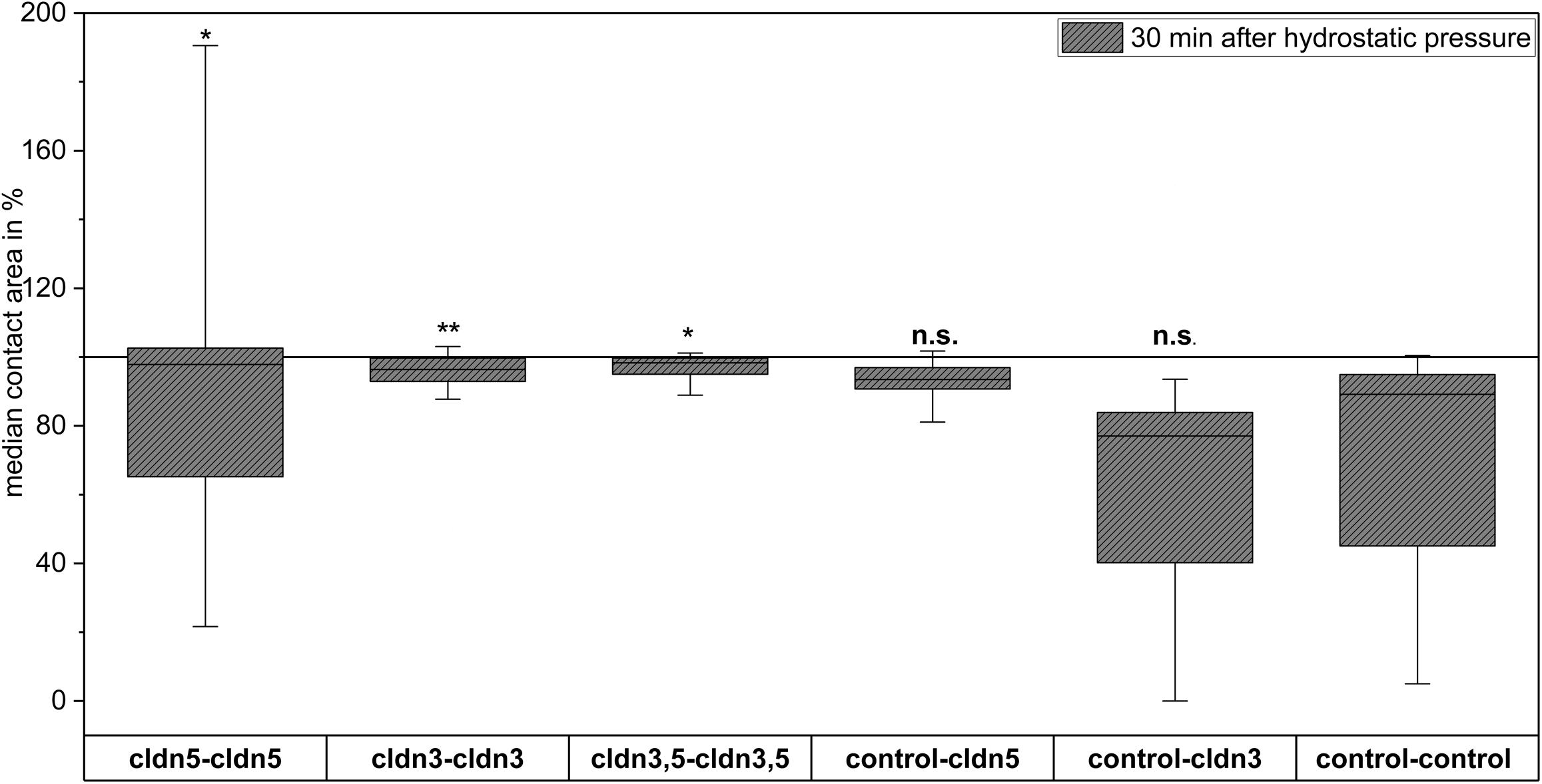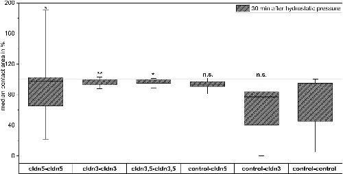 Figure 5. Contact areas of claudin-5, claudin-3, and coexpressing claudin-3 and claudin-5 oocytes in hydrostatic pressure impulse (HPI) challenge after stabilization period and 30 min after HPI (n = 16–70, *p < 0.05, **p < 0.01, Kruskal-Wallis followed by a Dunn–Bonferroni correction).