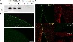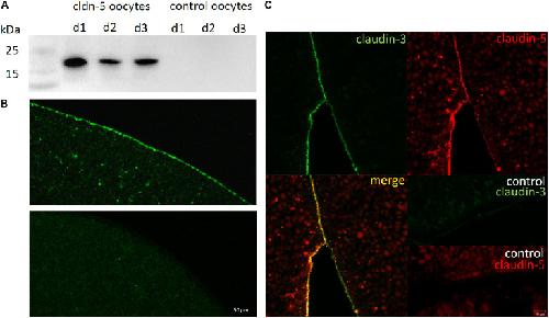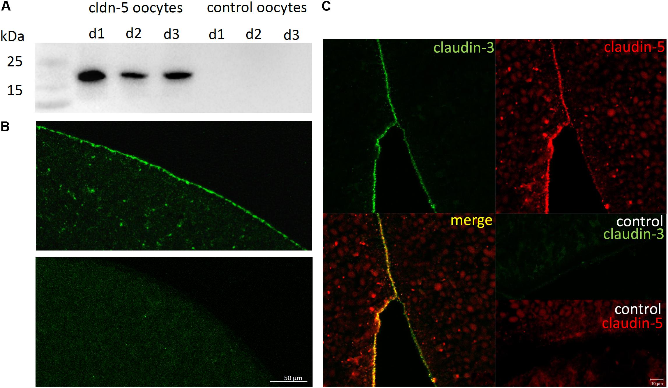 Figure 2. Detection of heterologously expressed claudins in Xenopus laevis oocytes. (A) Immunoblot analysis of tight junction protein claudin-5 in X. laevis oocytes of three animals (d1âd3). Cell membrane lysates were subjected to SDS-PAGE followed by immunoblot onto PVDF membranes. The membranes were incubated with primary antibodies and secondary peroxidase-conjugated antibodies (n = 3). (B) Immunofluorescent staining revealed specific claudin-5 signals (green) in oocyte membranes of all cRNA-injected oocytes, whereas in water-injected controls, no claudin-specific signals were detected in confocal microscopy. Representative images of oocytes derived from three animals. Scale bars: 50 μm. (C) Immunofluorescent staining of claudin-5 and claudin-3 expressing oocytes revealed specific claudin-3 signals (green) und claudin-5 signals (red) in oocyte membranes of cRNA-injected oocytes, whereas in water-injected controls, no claudin-specific signals were detected. Colocalization of expressed claudin proteins within the oocyte plasma membrane is revealed by double immunofluorescent staining (yellow). Scale bar: 10 μm.