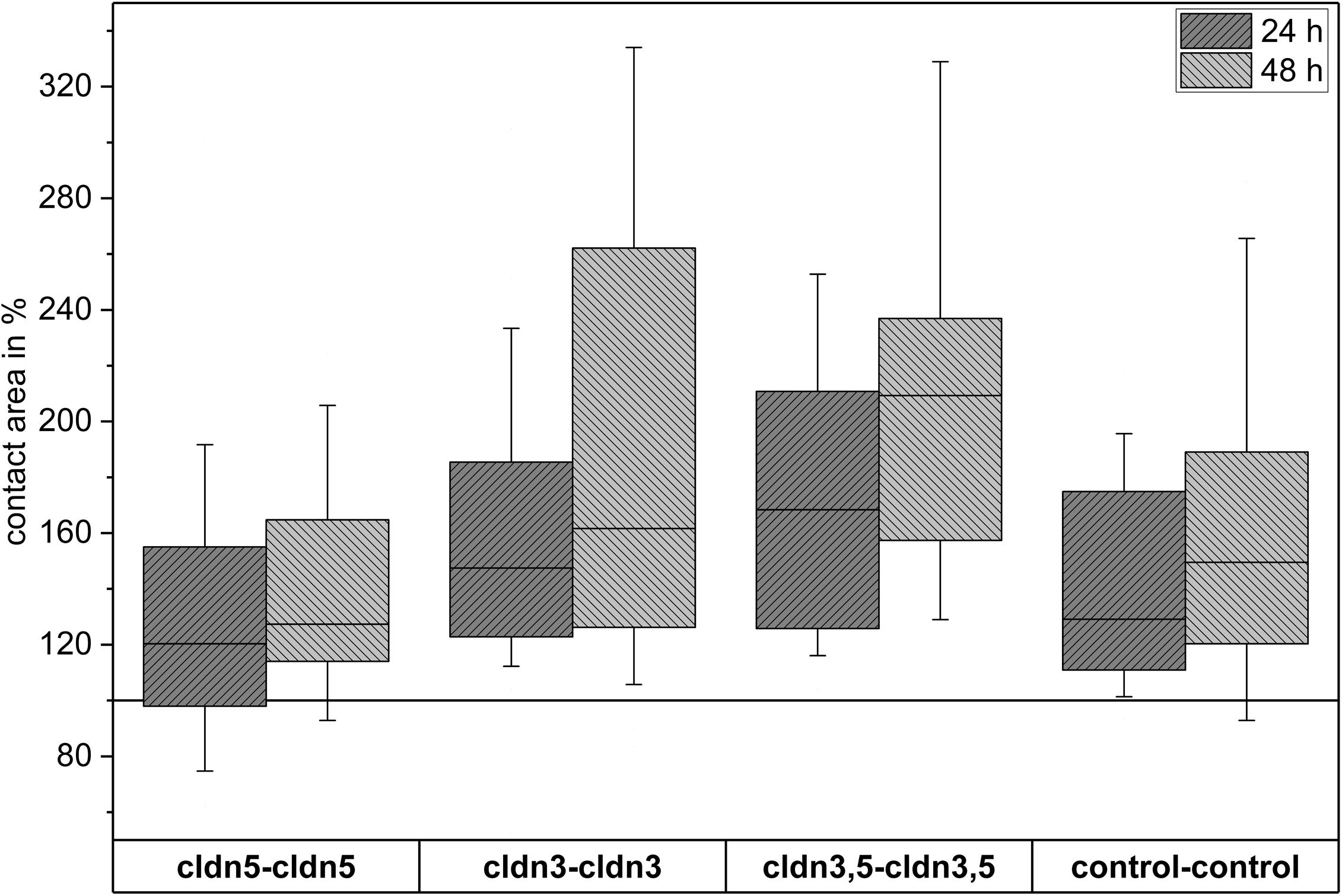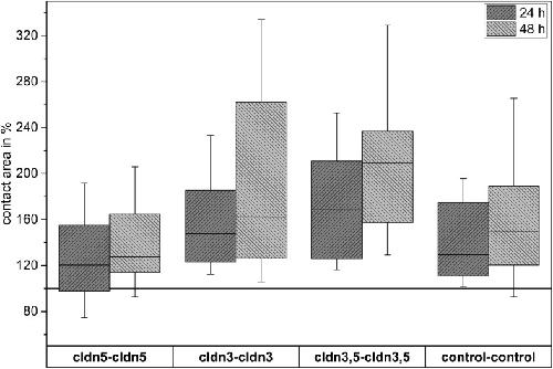 Figure 4. Median contact areas of clustered oocyte combinations cldn5âcldn5, cldn3âcldn3, cldn3,5âcldn3,5 and controlâcontrol 24 and 48 h after clustering in % of initial contact areas shortly after clustering (n = 8â38).
