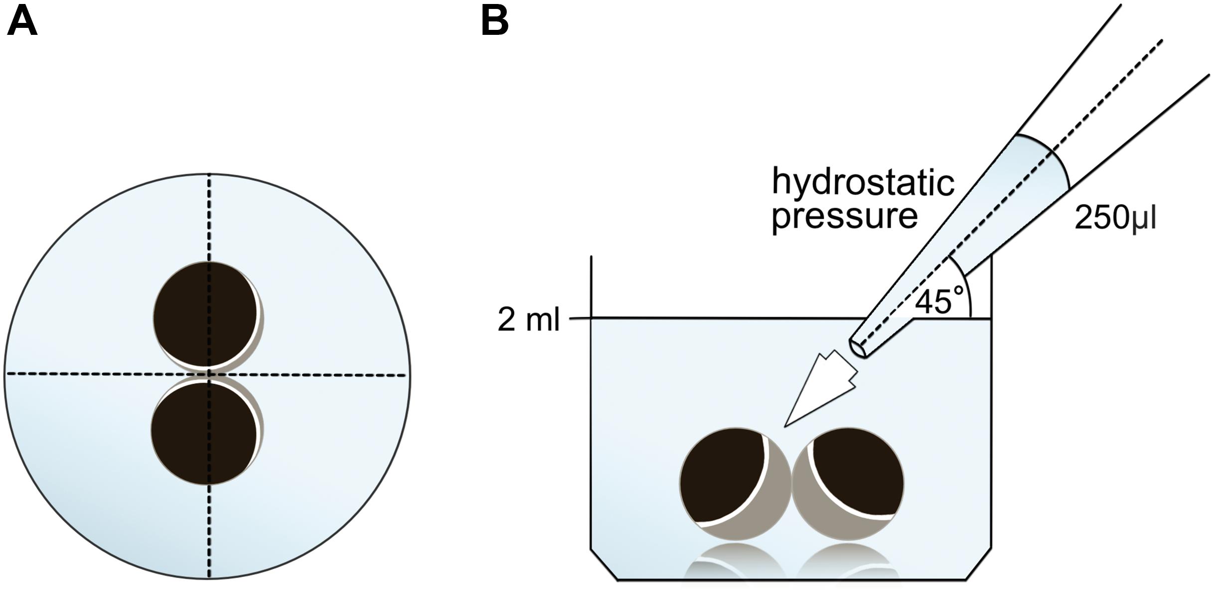 Figure 1. Experimental setup of hydrostatic pressure impulse assay (A) schematic top view of the well: central positioning of the oocyte pair was checked before application of the hydrostatic pressure. (B) Schematic side view of the well: 250 μl ORi was added using a single channel electronic pipette. The dispensing speed was uniformely set to maximum speed. The angle (45°) and distance of application was uniformely applied. Ambient pressure, viscosity of ORi and diameter of pipette tip opening were kept under constant conditions.
