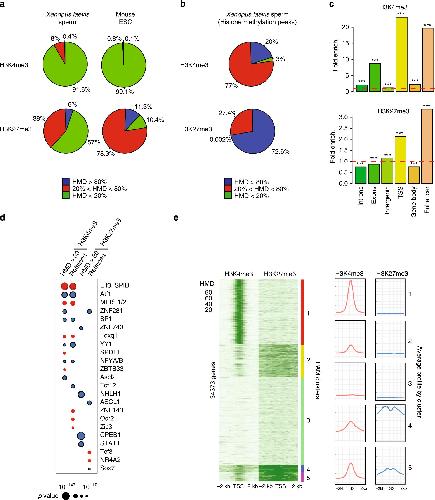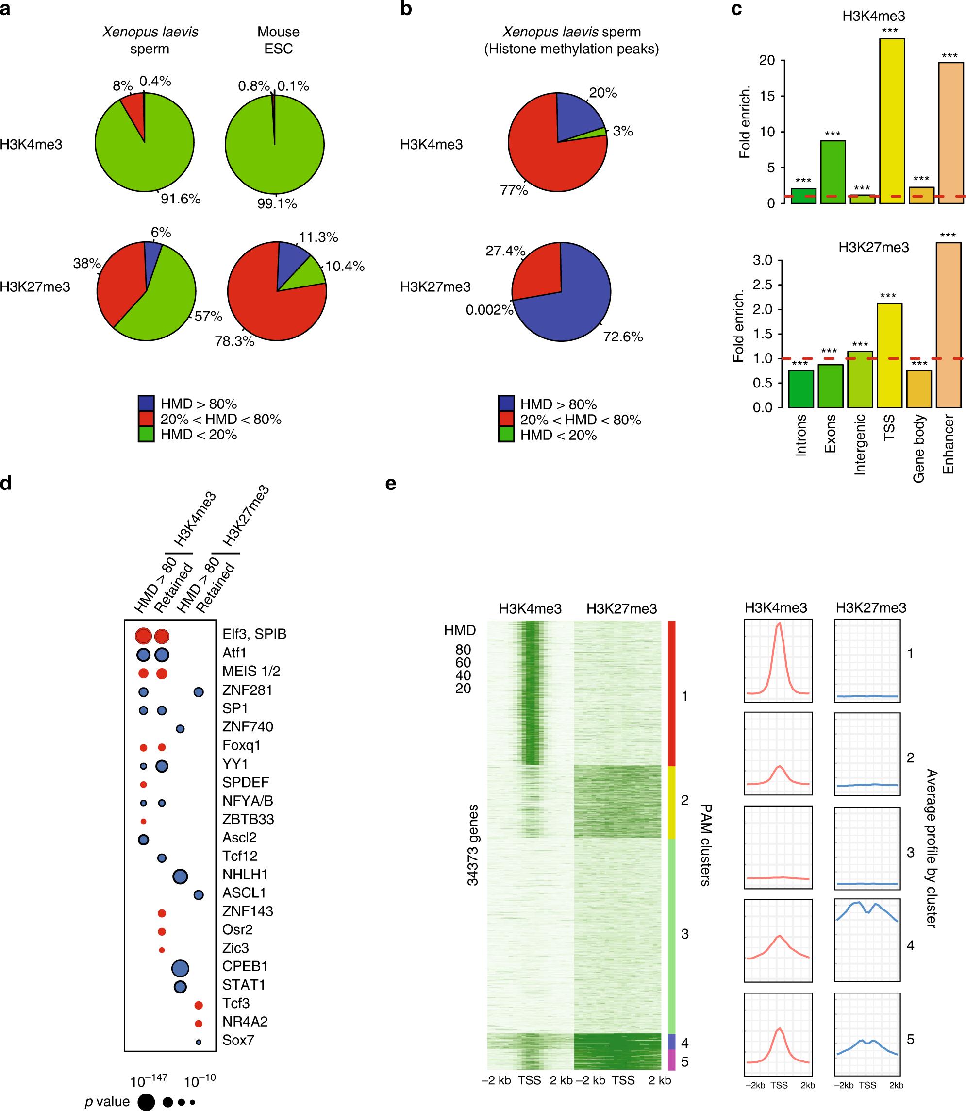 a Percentage of the genome with different range of apparent histone H3 methylation density (HMD) on Lysine 4 and 27 in Xenopus Laevis sperm and mouse ESC. b Percentage of H3K4me3 and H3K27me3 peaks with different range of HMD in Xenopus Laevis sperm. c Fold enrichment (observed/random) over 1000 randomisations of peaks with homogeneous histone methylation (HMDâ>â80) at the indicated genomic features; ***: empirical p valueâ<â1eâ3. ICe-ChIP data from two independent replicates were pooled. d Dot matrix showing transcription factors with enriched motifs (y-axis) in the different histone methylation categories (x-axis). Circle size represents âlog10 (p value) of the motif enrichment; and the circle colour indicates whether evidences exist indicating that the corresponding transcription factors is present maternally (blue) or not (red). Retained HMDâ>â80 peaks correspond to sperm histone methylation peaks maintained after extract treatment as in Fig. 5. e Heat map after PAM clustering of promoters (TSS +/â2âkb) according to histone H3-methylation density on Lysine 4 and 27. The plots on the left show the average HMD profile for each cluster. Source data related to a, b, d, and e are provided as Source Data files.
