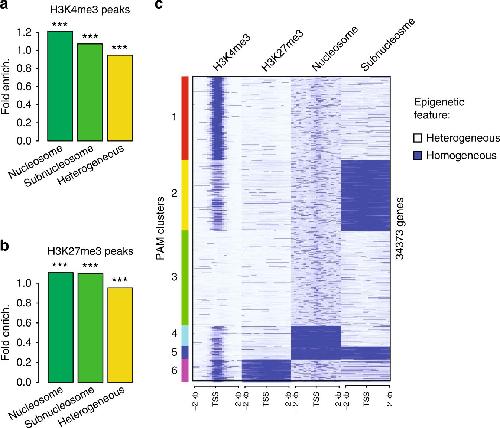 a Fold enrichment (observed/random) over 1000 randomisations of peaks with homogeneous H3K4 methylation (HMDâ>â80) in regions homogeneous for nucleosomes, homogeneous for subnucleosomes or with heterogeneous particle composition in a sperm population; ***: empirical p valueâ<â1eâ3. b Same as in a for H3K27 methylation. c PAM clustering of promoter (TSS +/â2âkb) according to homogeneity for methylation of histone H3 (HMDâ>â80) on Lysine 4, on Lysine 27, enrichment for nucleosomes and enrichment for subnucleosomes. Source data related to c is provided as a Source Data file. ICe-ChIP data from two independent replicates were pooled.