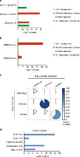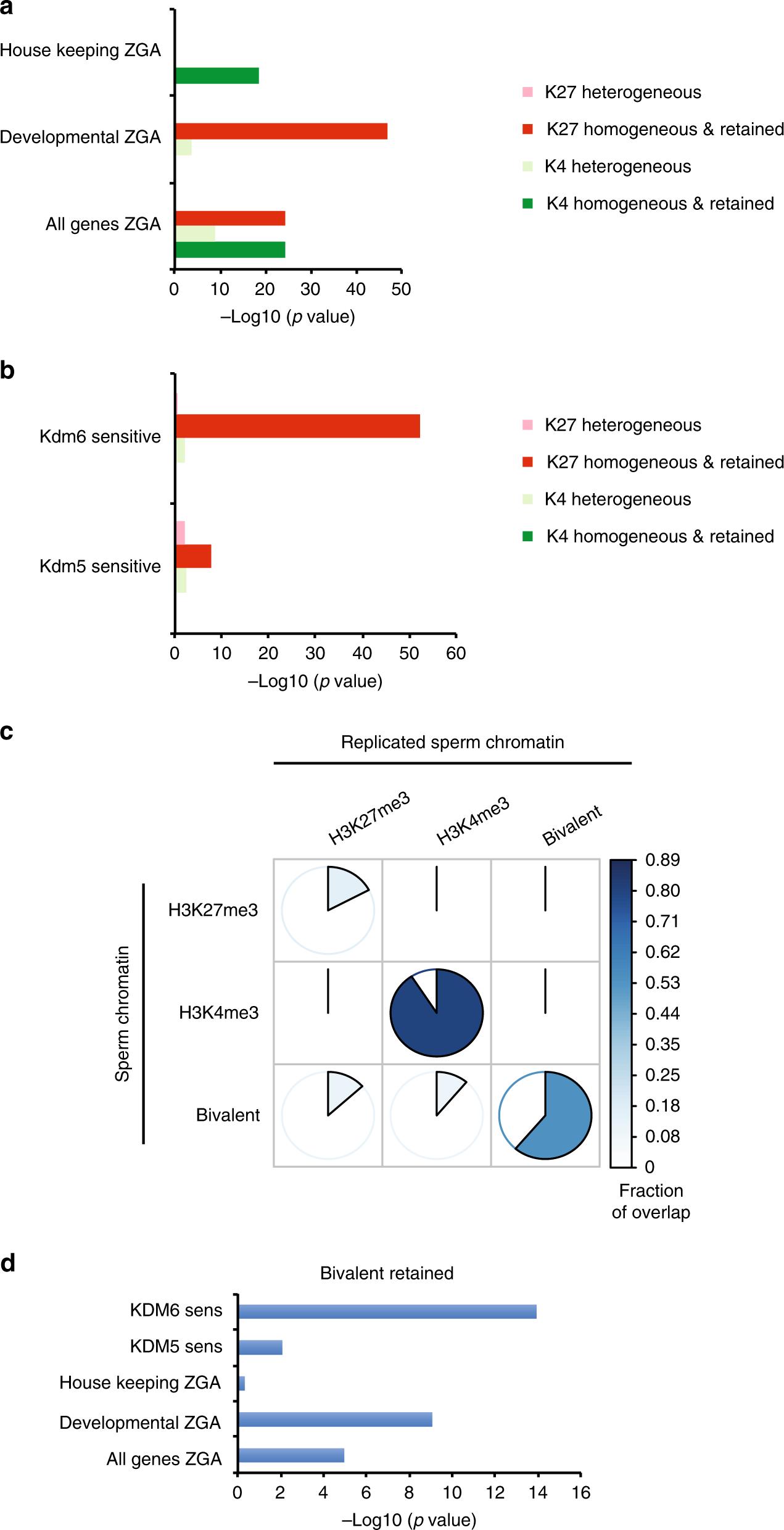 a Barplot of enrichment p values (âlog10) in set of genes expressed at zygotic gene activation (all-, developmental- and house keeping-ZGA genes) for the presence of different type of H3K4me3 or H3K27me3 sperm peaks. pink and light green barsâ=âenrichment p value for heterogenous (HMDâ<â80) peaks in promoter; red and green barsâ=âenrichment p value for homogeneous (HMDâ>â80) peaks in promoter that are also retained after replication. P values determined by the Ï2 proportion test evaluating if the proportion of gene of interest is higher (alternativeâ=ââgreaterâ) than the genome-wide proportion (i.e., expected proportion). b Barplot of enrichment p values (âlog10) in set of genes whose embryonic expression is sensitive to the presence of histone H3K4 demethylase (Kdm5b) or histone H3K27 demethylase (Kdm6b) at fertilisation2 for the presence of the aforementioned sperm peaks categories. P values are obtained as in a. c Pie chart indicating the percentage of the homogeneously methylated histone present in sperm that are retained after egg extract-mediated replication. Three type of sperm peaks are considered: homogeneous for H3K27me3 only, homogeneous for H3K4me3 only and homogeneous for H3K27me3 and H3K4me3 (bivalent). The area of the coloured sector (together with the colour) indicates the fraction of the overlap between each pair-wise comparison. d Barplot of enrichment p values (âlog10) in various set of genes for the presence of a homogeneous bivalent H3K4me3 and H3K27me3 retained after replication. P values are obtained as in a. HMD are from data pooled from two independent replicates. Peaks retention/lost are consensus from three independent replicates. Set of kdm5 and kdm6 sensistivite genes are from three independent replicates.