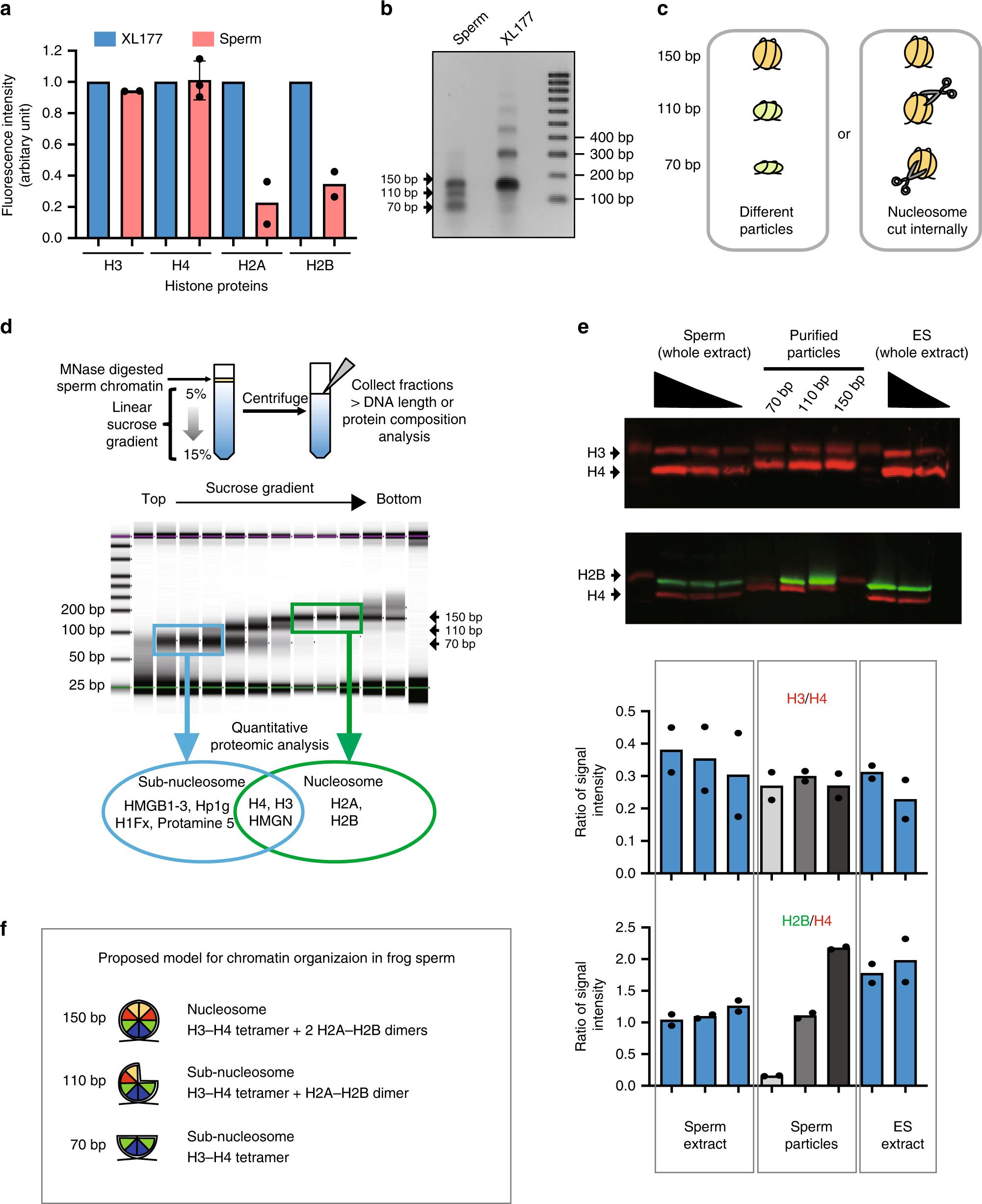 a Xenopus laevis sperm core histones content relative to that found in a somatic cell (XL-177) as measured by quantitative WB (H2A, H2B, H3 nâ=â2, H4 nâ=â3, biologically independent samples error bar on H4 shows standard deviation). b DNA fragments generated by MNase digestion of Xenopus laevis sperm and somatic cell. c Schematic representation of the possible origin of subnucleosomal sized fragments generated by MNase treatment of sperm chromatin. d Nucleoproteic particles generated by MNase treatment of sperm are centrifugated on a sucrose gradient. Subsequently, particles isolated along the gradient are analysed for associated DNA fragment length (electrophoresis) and for associated proteins (mass spectrometry). e WB analysis confirms mass spectrometry analysis. Similar ratio of H3 to H4, and decreased level H2B to H4 are detected in subnucleosomes compared with nucleosomes. Xenopus sperm and mESCs are shown as control. Graphs below show the quantification of WB data (nâ=â2, biologically independent samples). f Model of core histone composition of Xenopus laevis sperm nucleosomal and subnucleosomal particle. Source data related to a, b, d and e are provided as Source Data files.